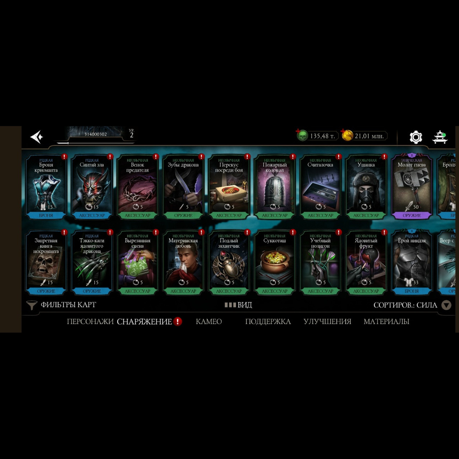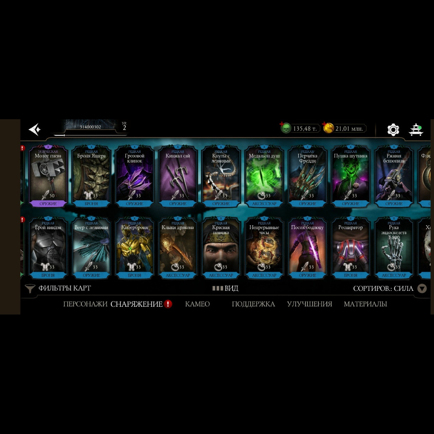 Вся редкая именная снаряга фул Х слияния + чуть чуть снаряги из башен. 4 555 карт повышение уровня + 135 к душ и 15 млн золота.