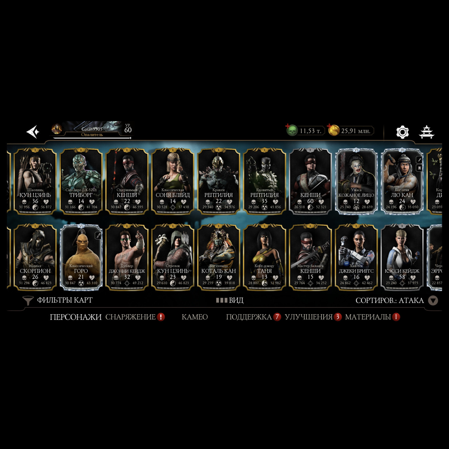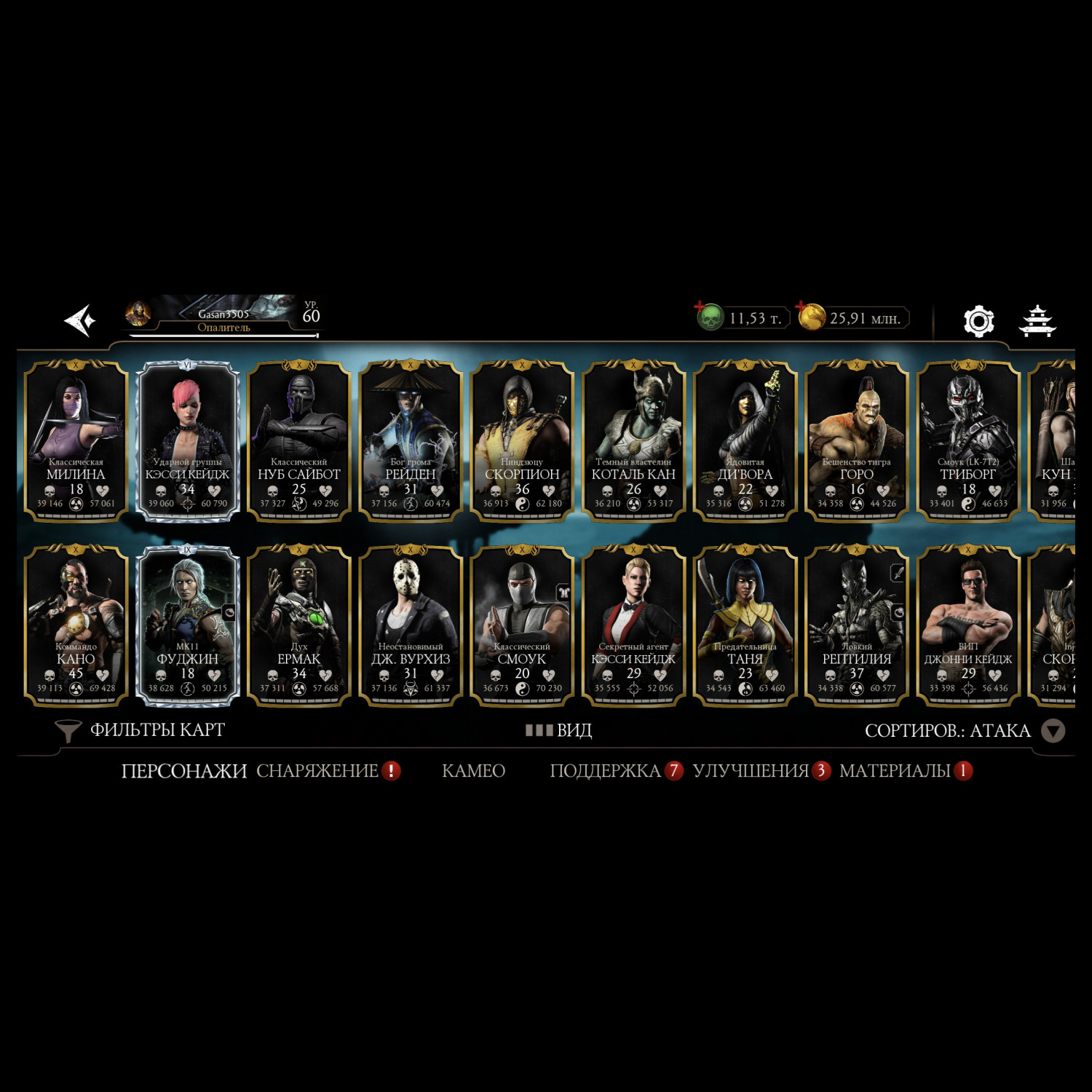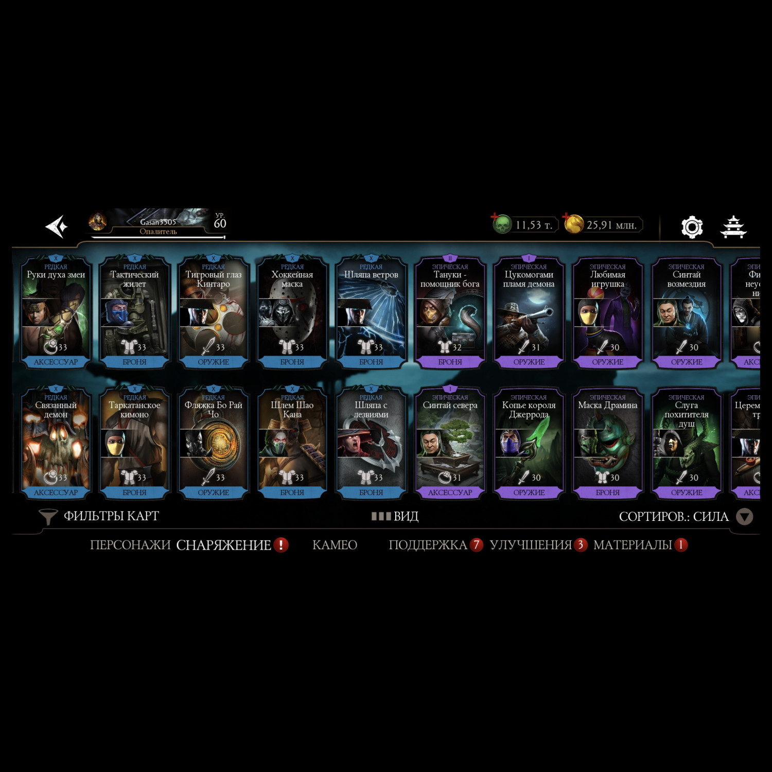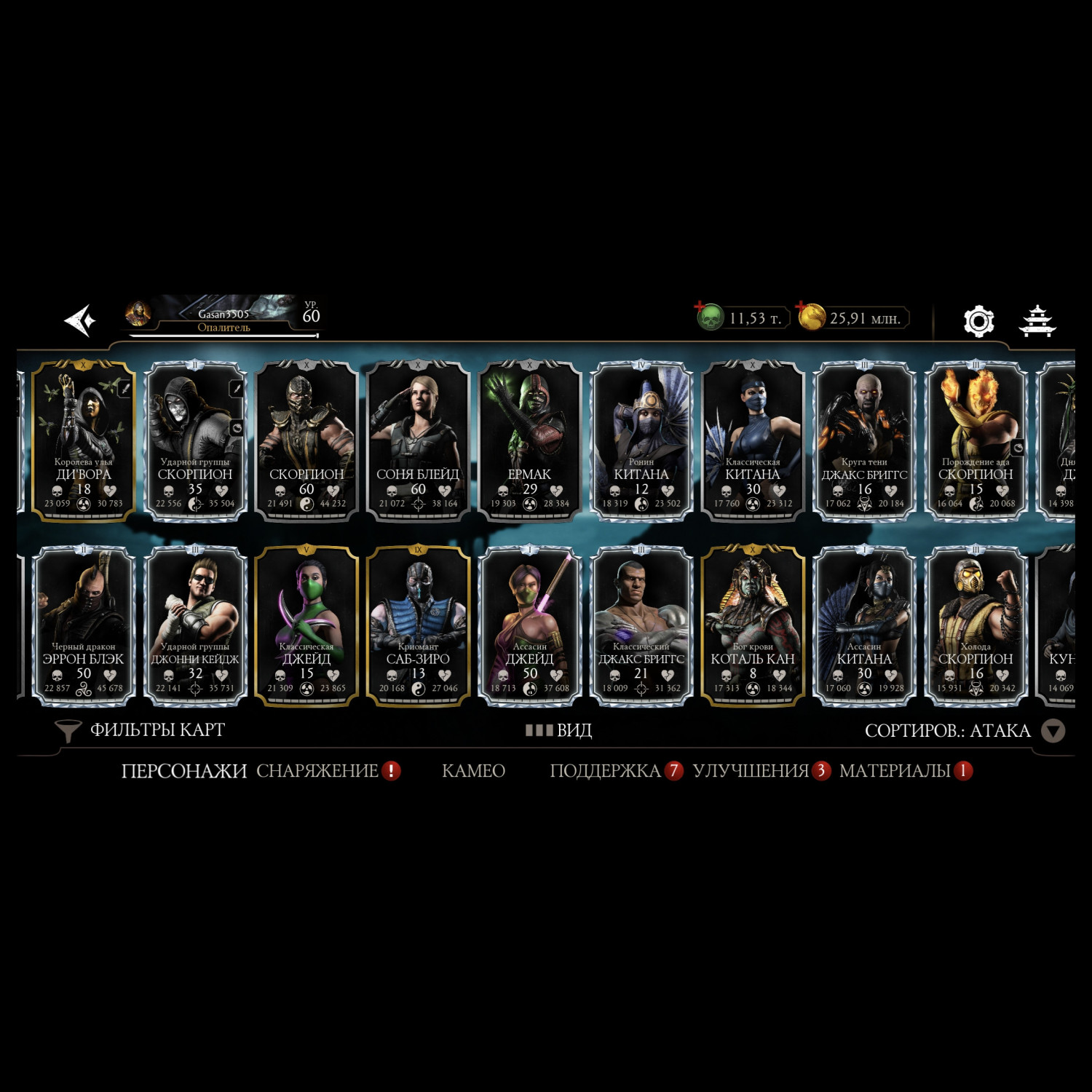 На аккаунте есть 11тыс.душ и 25млн золота,есть снаряжение эпическое с башен,также редкие персонажи,такие как классический фильм рейден,соня блейд,Джонни кейдж, гоуст фейс,бог огня люкан ,мк 11 фуджин