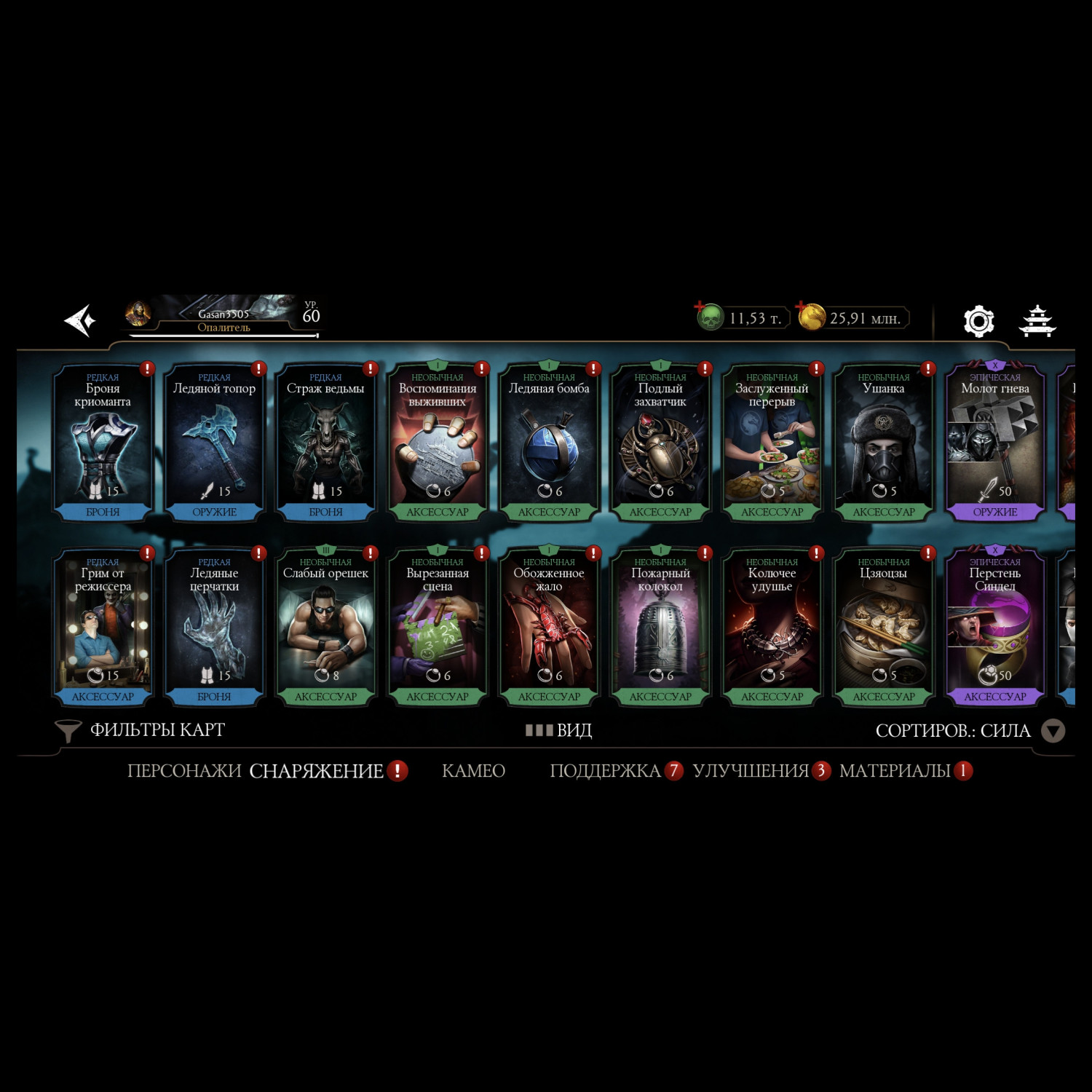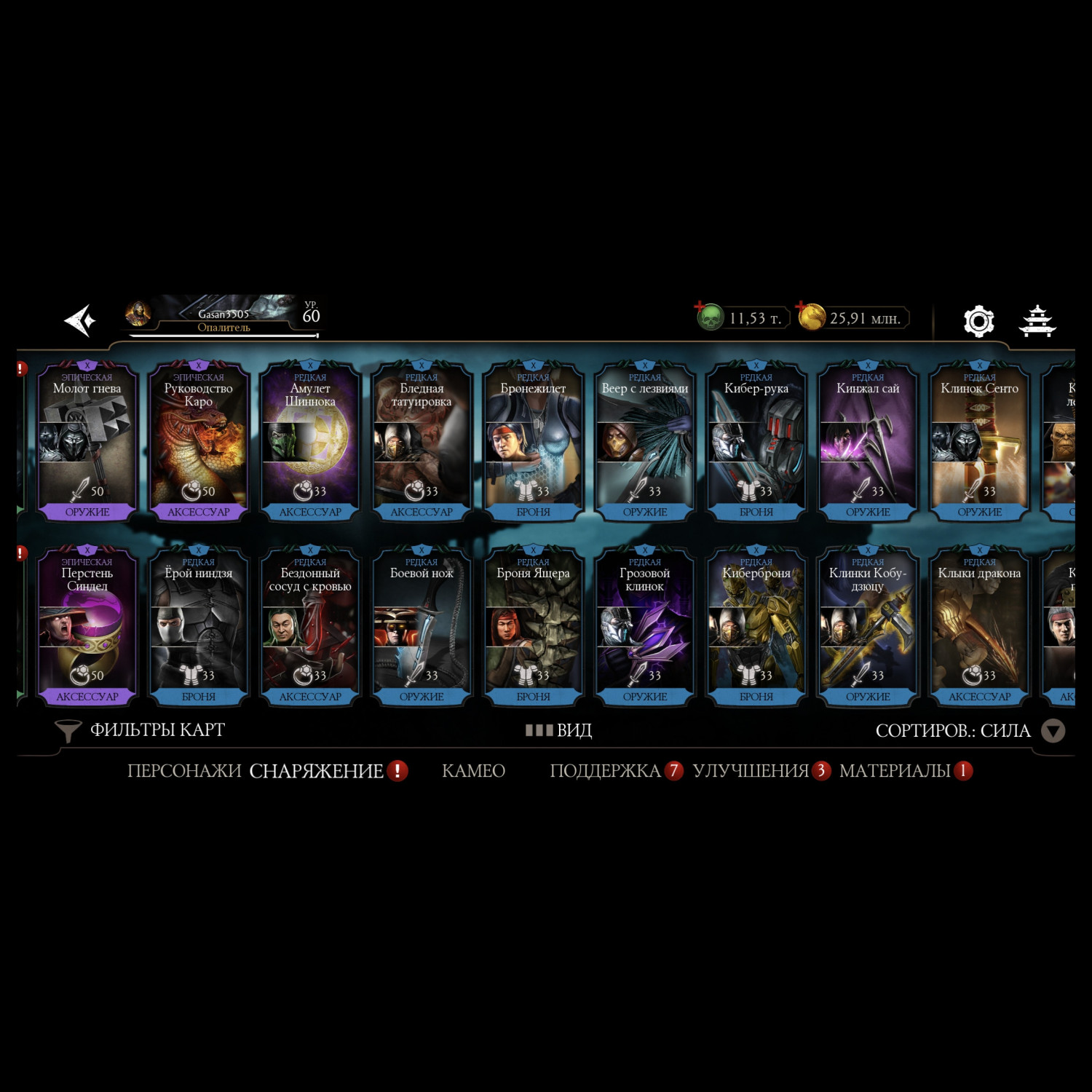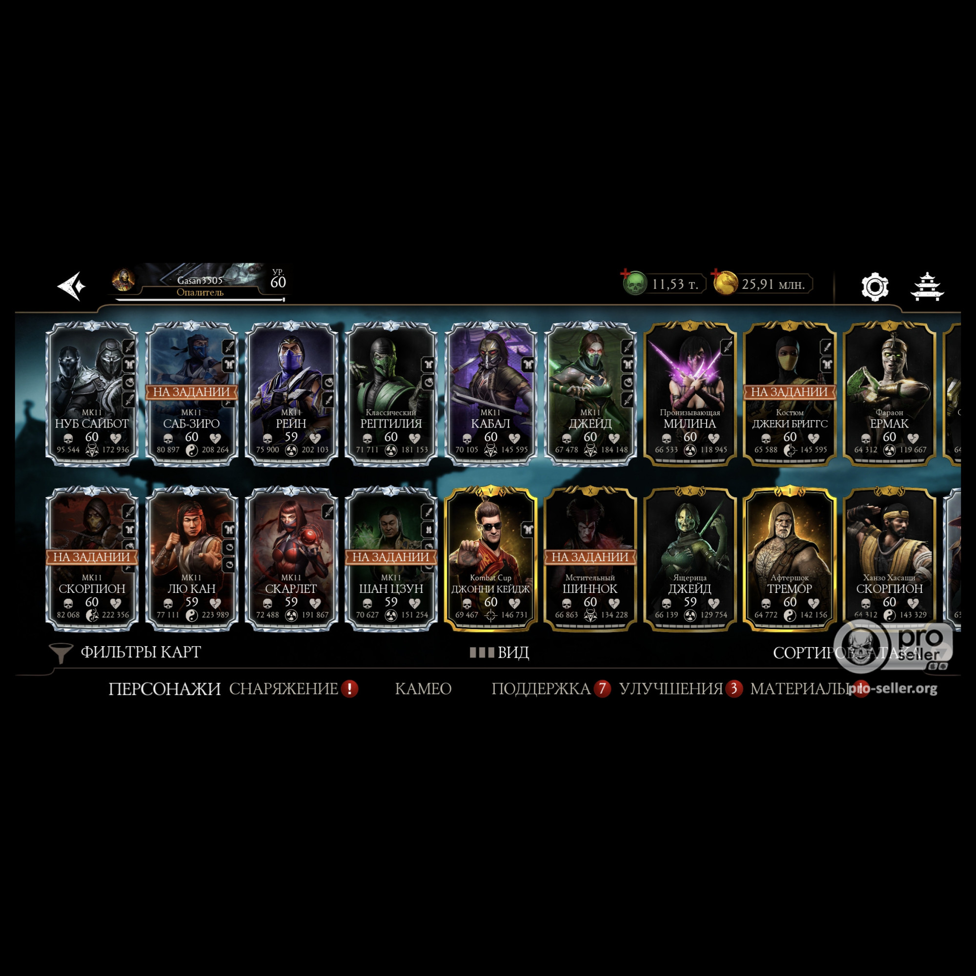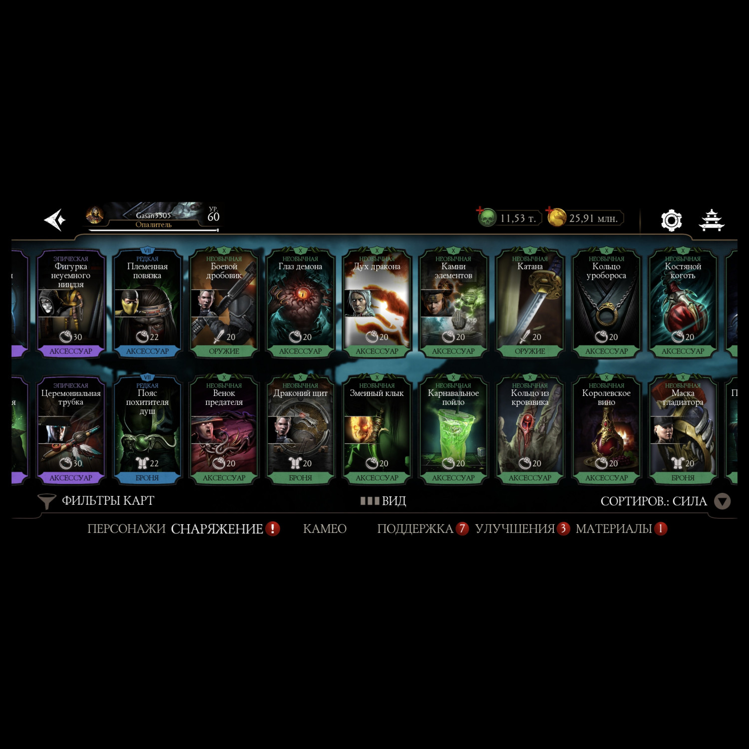 На аккаунте есть 11тыс.душ и 25млн золота,есть снаряжение эпическое с башен,также редкие персонажи,такие как классический фильм рейден,соня блейд,Джонни кейдж, гоуст фейс,бог огня люкан ,мк 11 фуджин