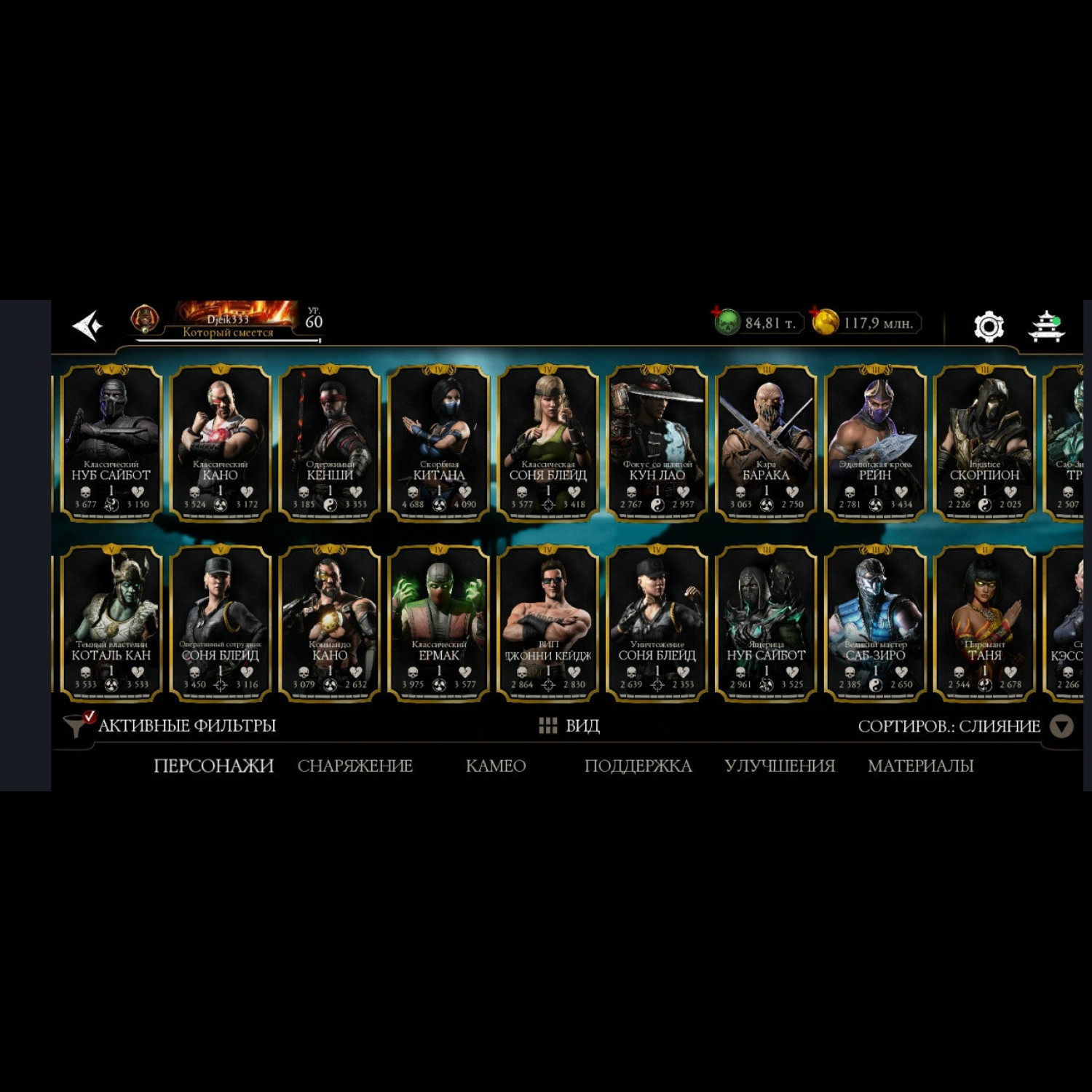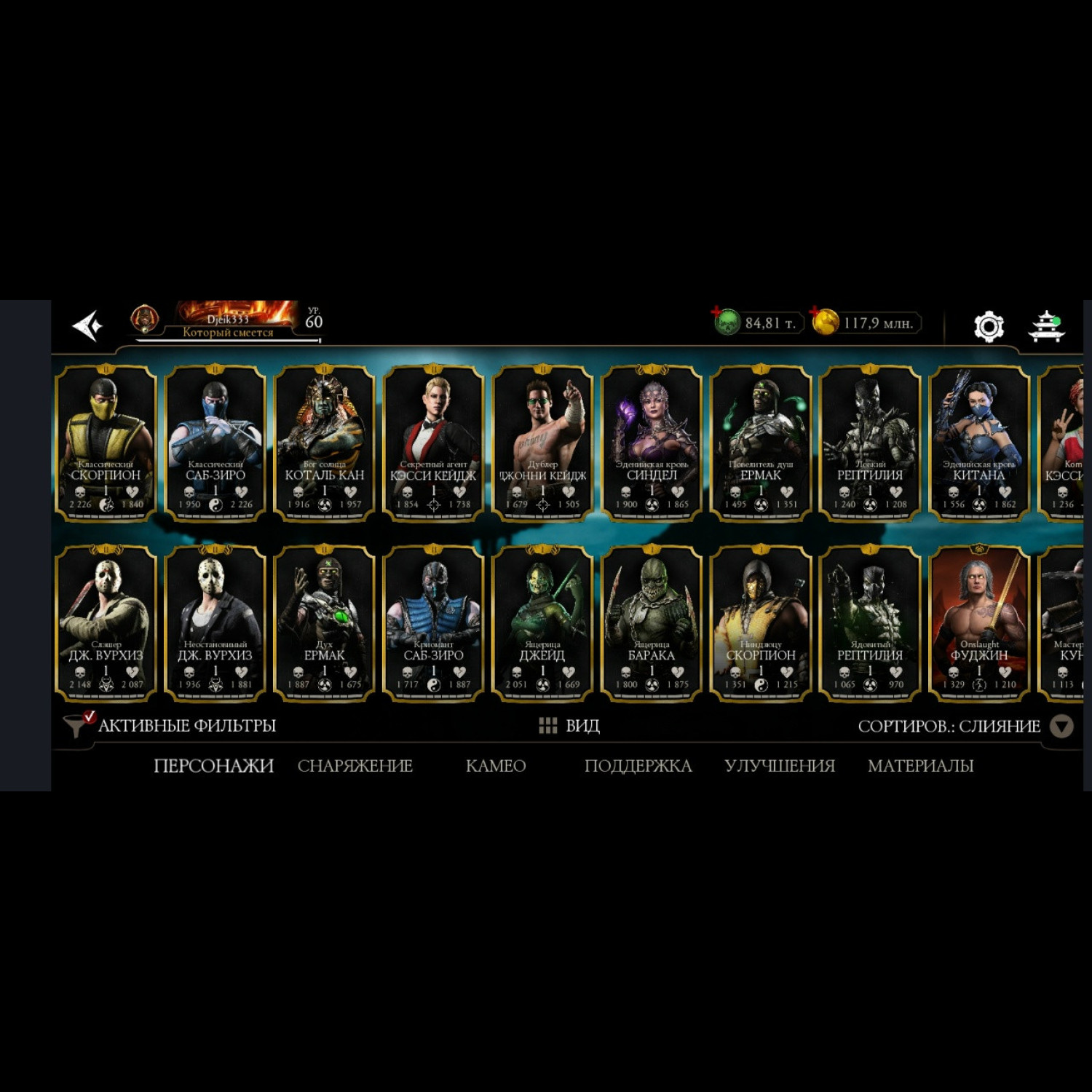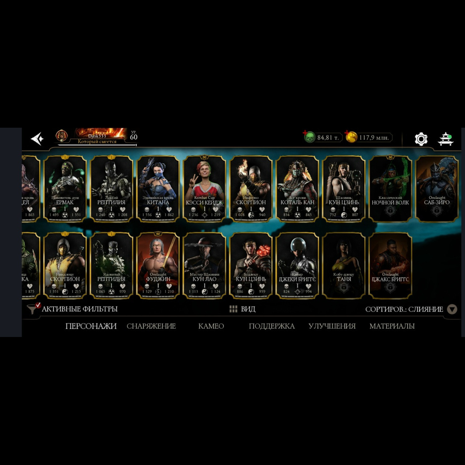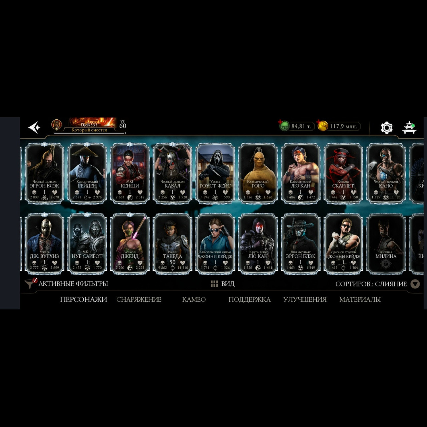 Есть 35 алмазных, из них 5 Х слияния (Китана МК 2, Милина МК1, новая Фрост мк11 + Саб Зиро и Скарлет МК11) + 11 от 3 до 8 слияния. Есть 84 из 87 золотых, из золота 10 Фул Х слияния, (Классические Кабал и Скарлет Фул Х слияния) а так же Есть вся редкая именная снаряга Х слияния + немного из башен + карты повышения уровня + 84 к душ и 117 млн золота.