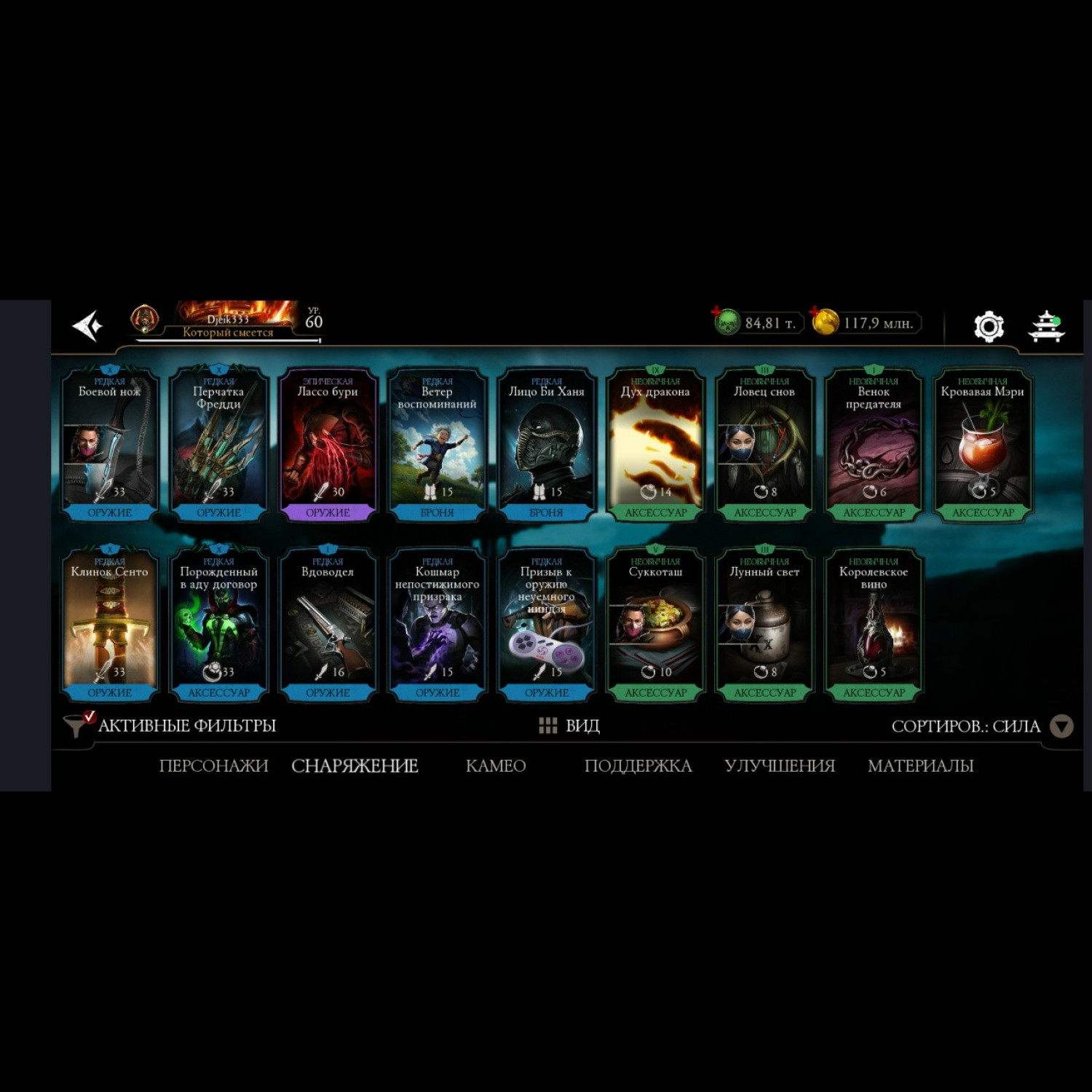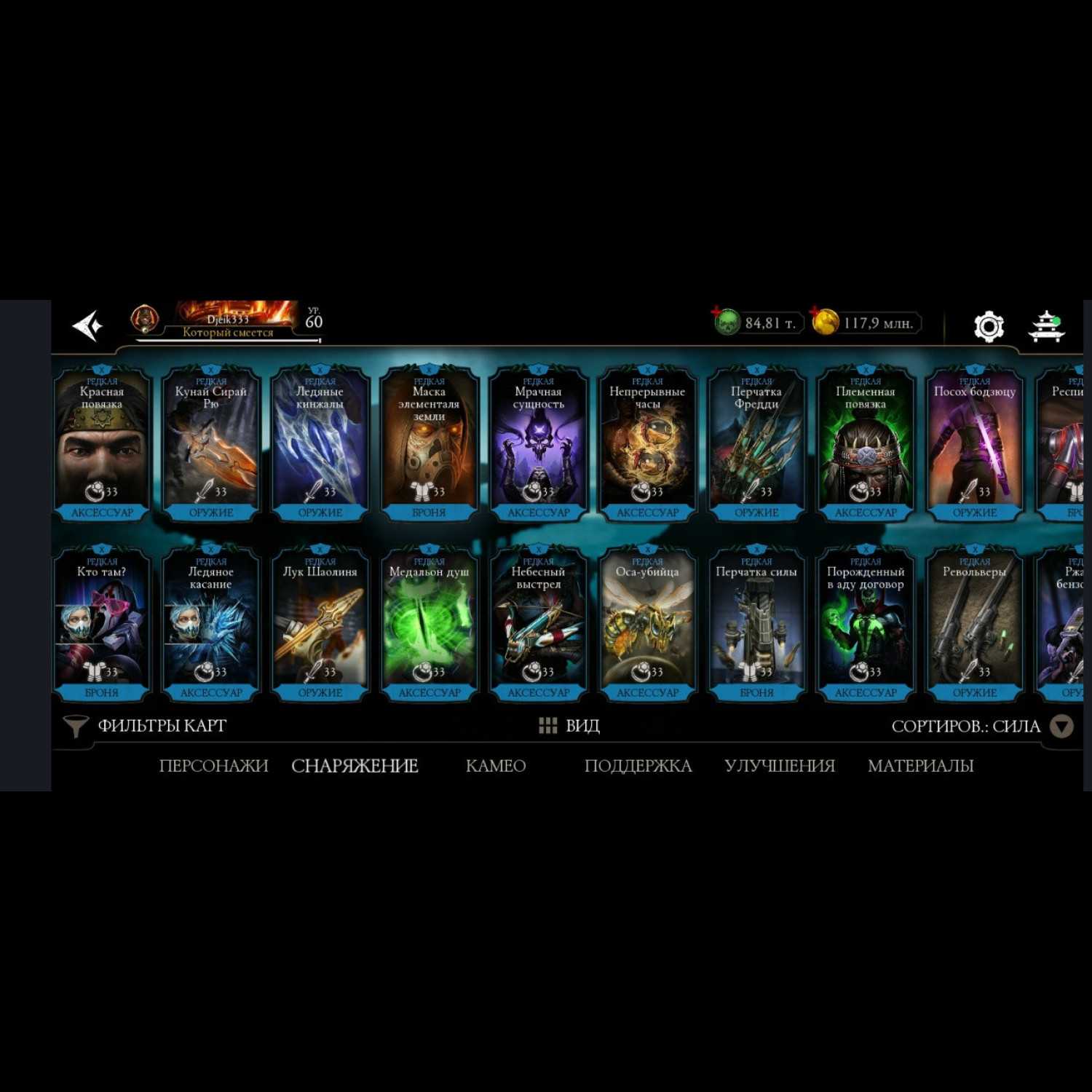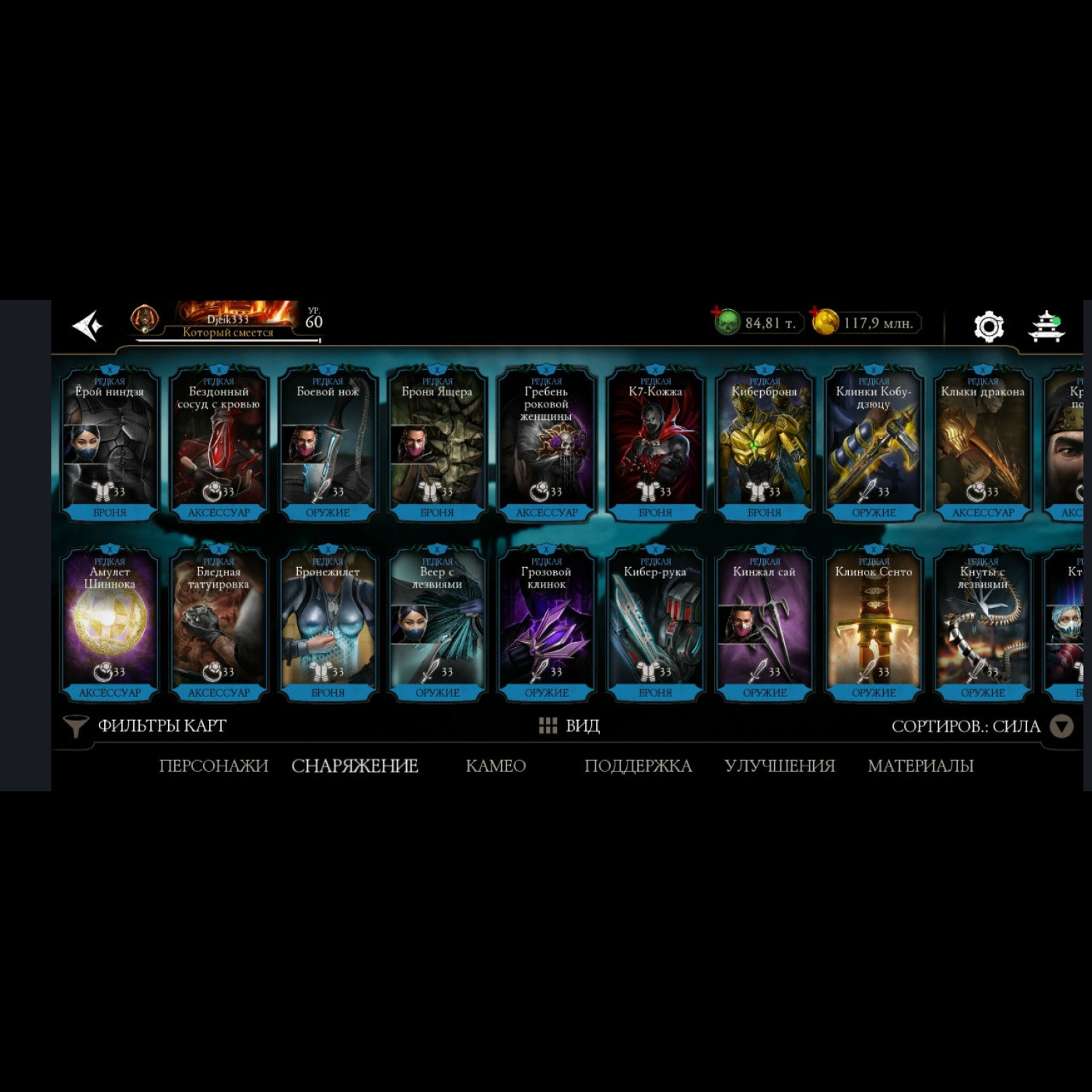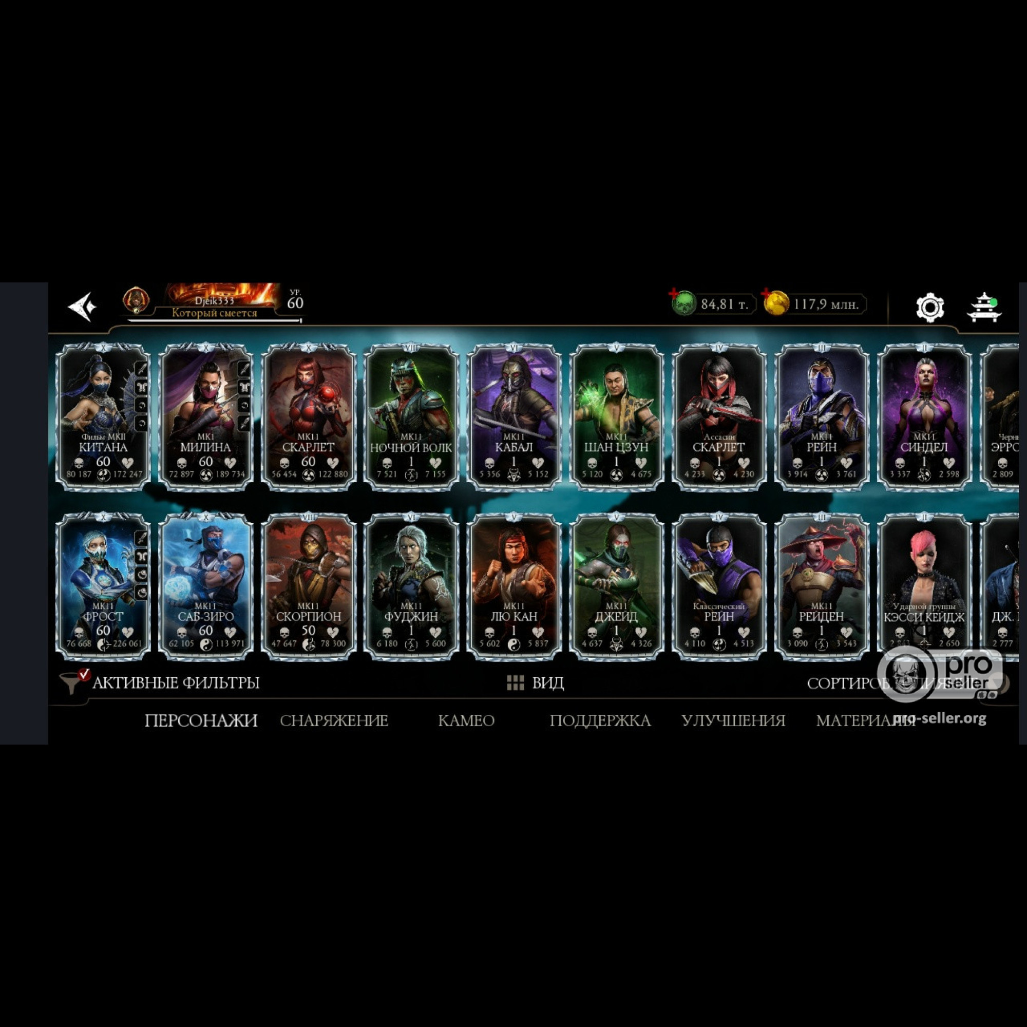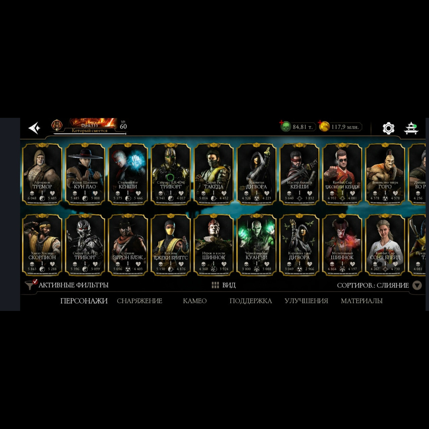 Есть 35 алмазных, из них 5 Х слияния (Китана МК 2, Милина МК1, новая Фрост мк11 + Саб Зиро и Скарлет МК11) + 11 от 3 до 8 слияния. Есть 84 из 87 золотых, из золота 10 Фул Х слияния, (Классические Кабал и Скарлет Фул Х слияния) а так же Есть вся редкая именная снаряга Х слияния + немного из башен + карты повышения уровня + 84 к душ и 117 млн золота.