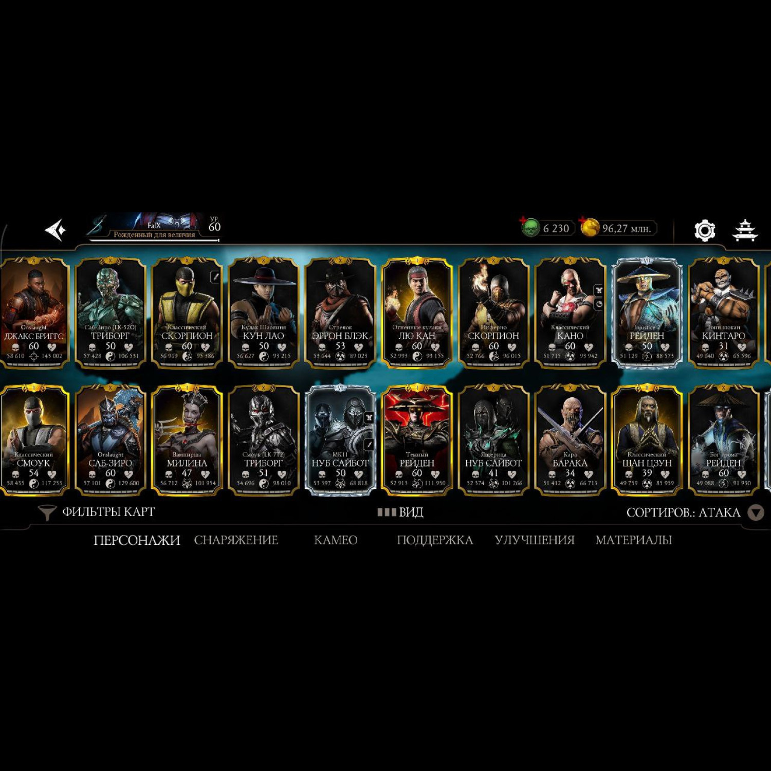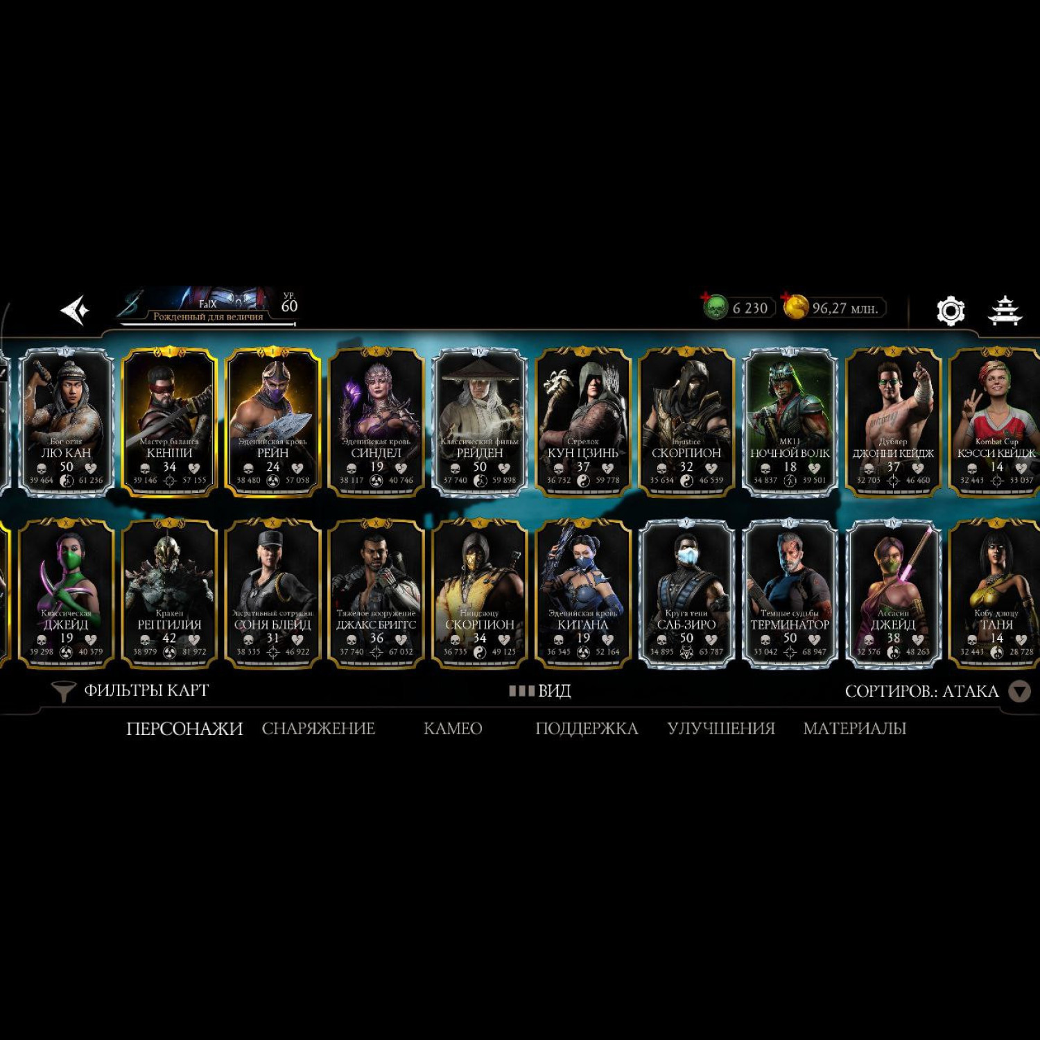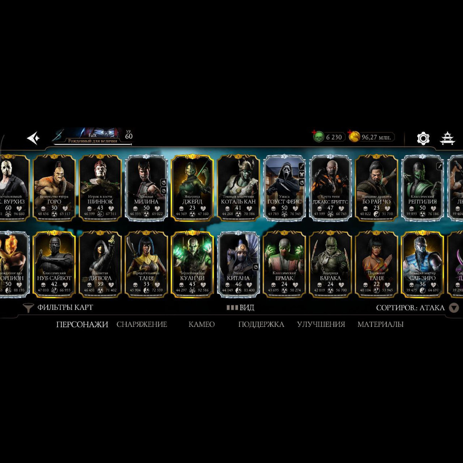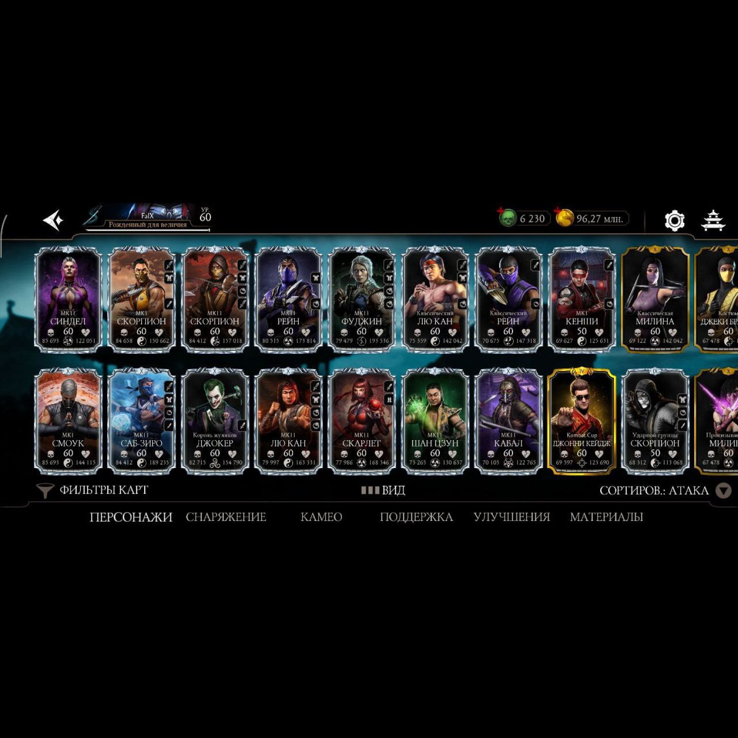 Аккаунт 60 уровня, 6230 душ, 96 млн монет, почти все персонажи кроме ассасин китаны и китаны мк2 фильм, почти все мк11 10 слияния и не сколько мк1 персонажей 10 и 9 слияния, достаточное количество бруталити. Полностью прокаченный смоук мк1 с бруталити.