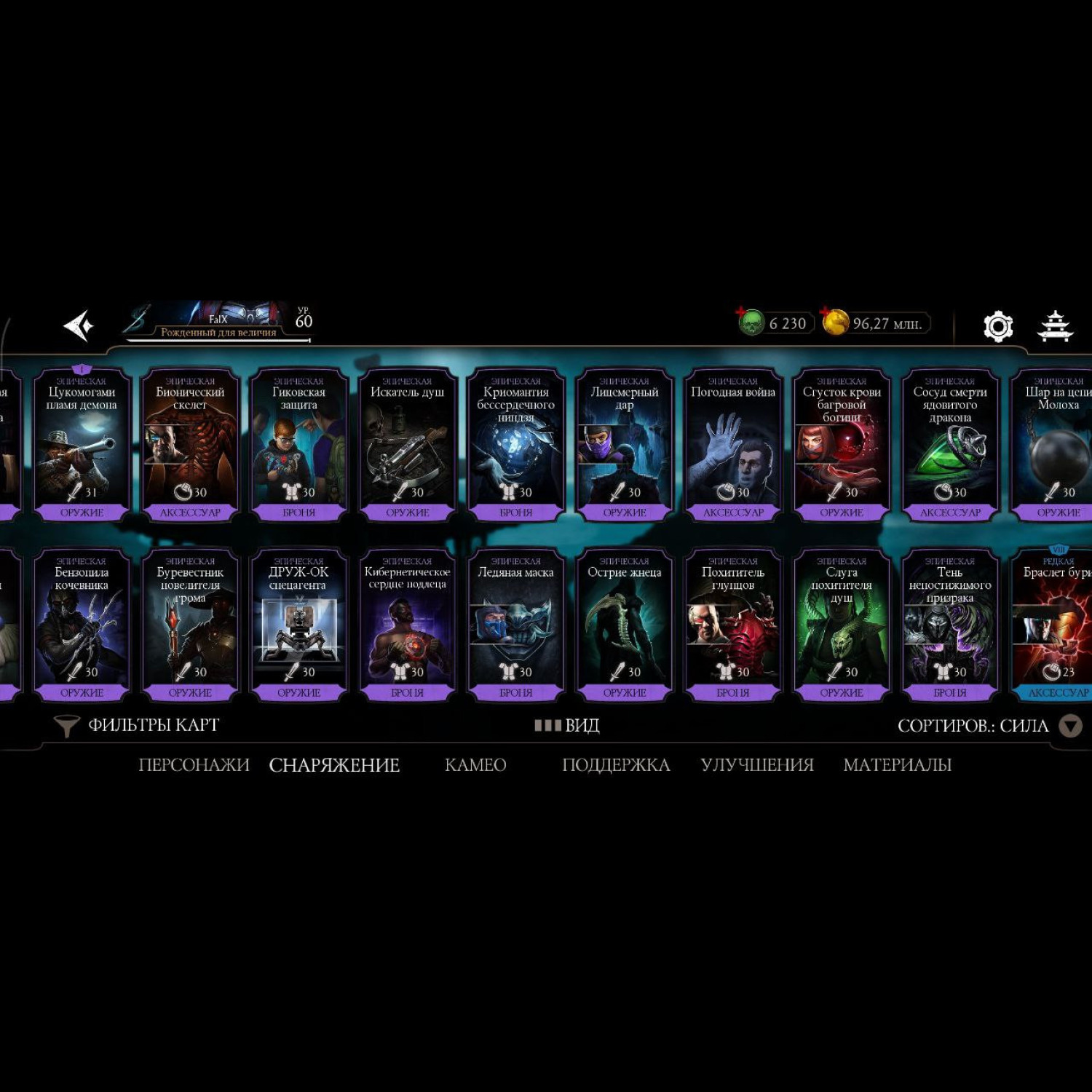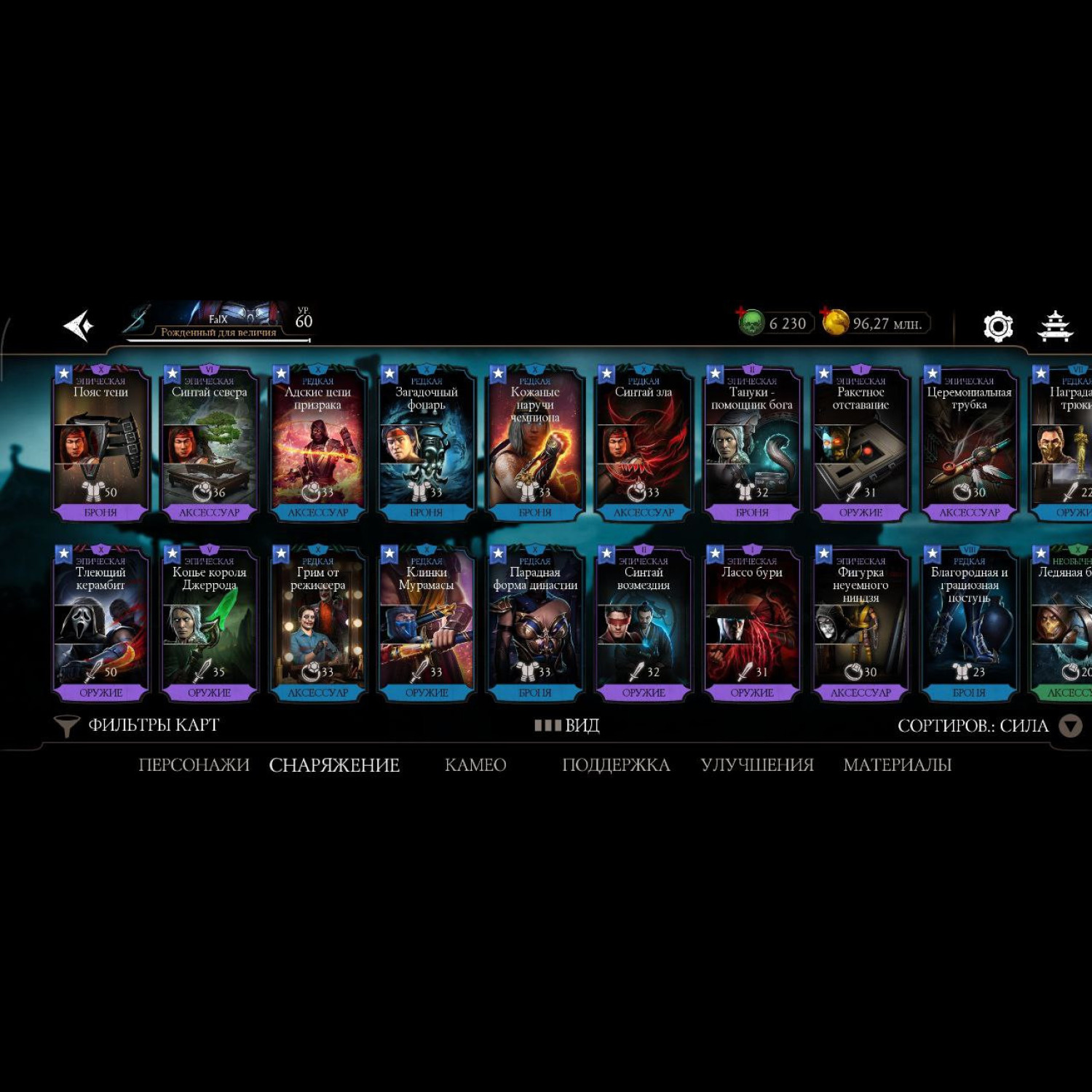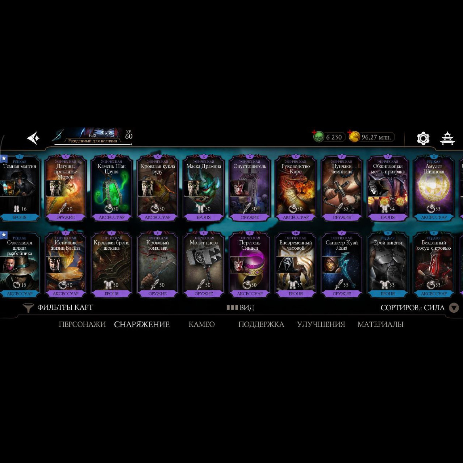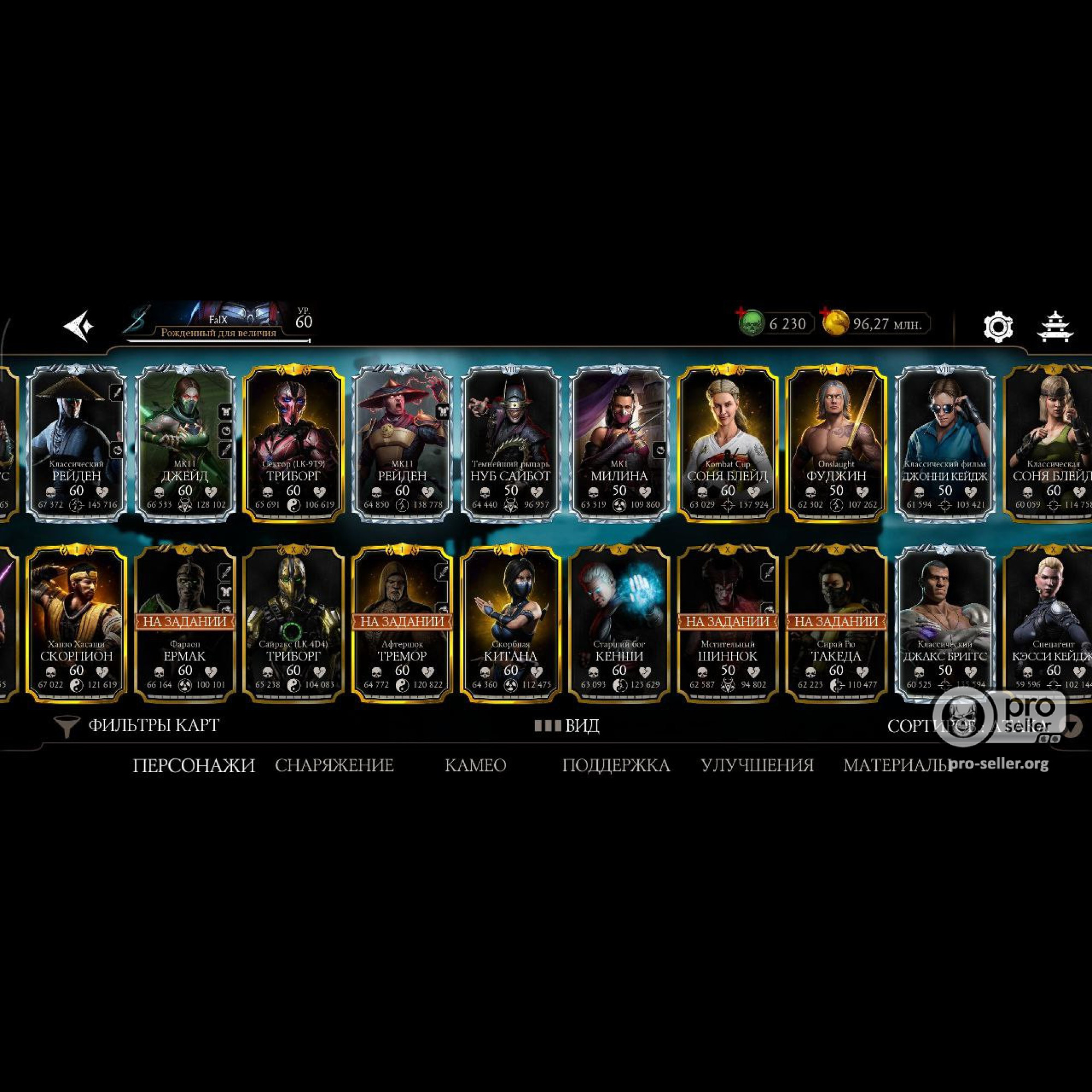 Аккаунт 60 уровня, 6230 душ, 96 млн монет, почти все персонажи кроме ассасин китаны и китаны мк2 фильм, почти все мк11 10 слияния и не сколько мк1 персонажей 10 и 9 слияния, достаточное количество бруталити. Полностью прокаченный смоук мк1 с бруталити.