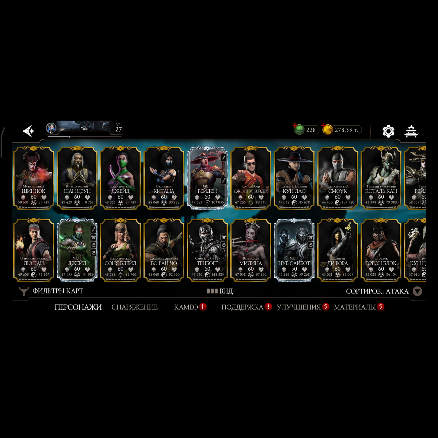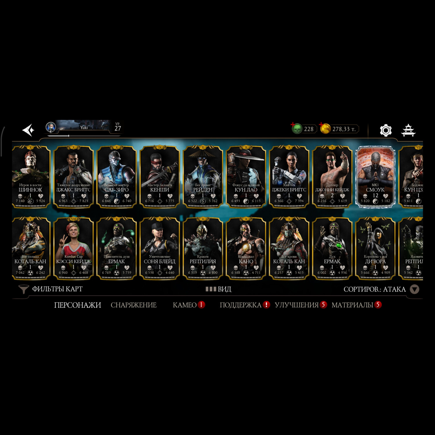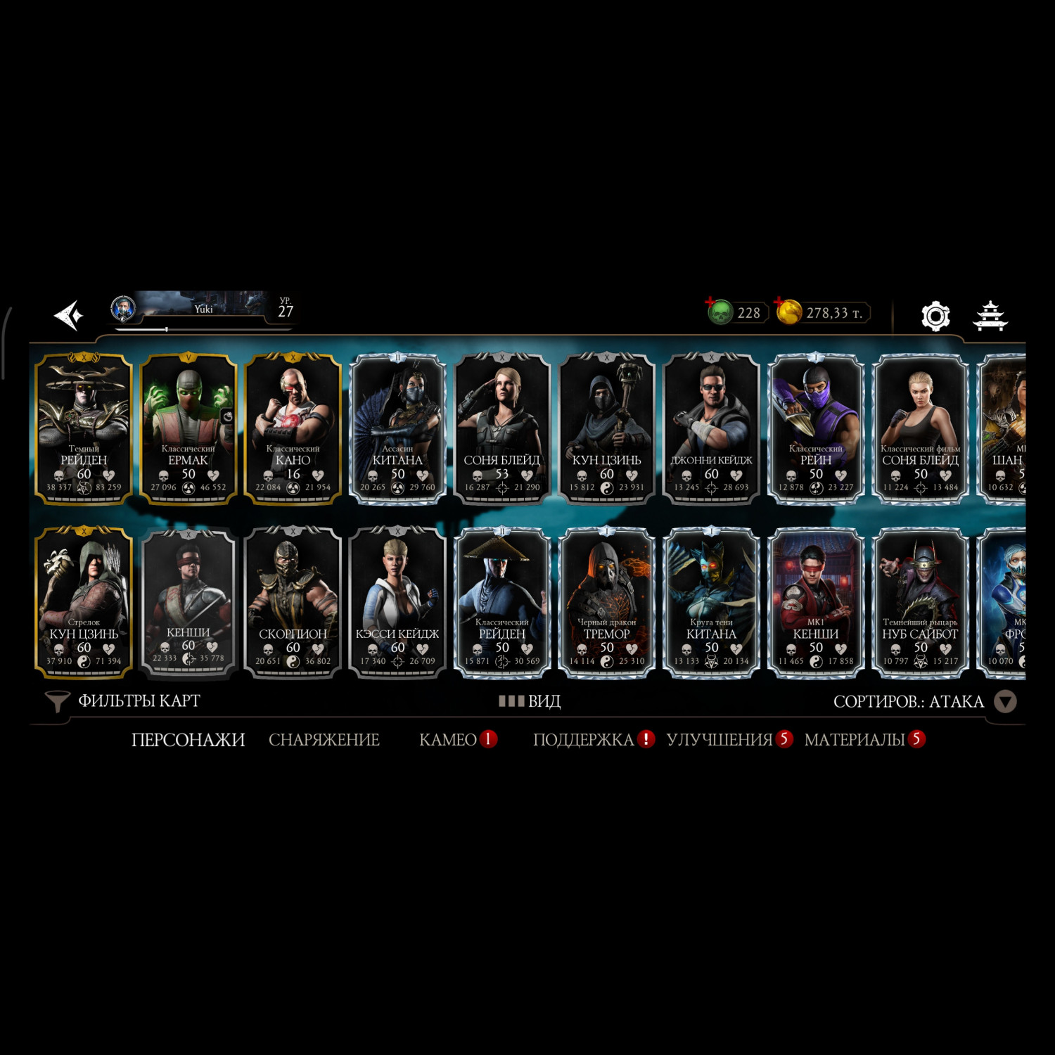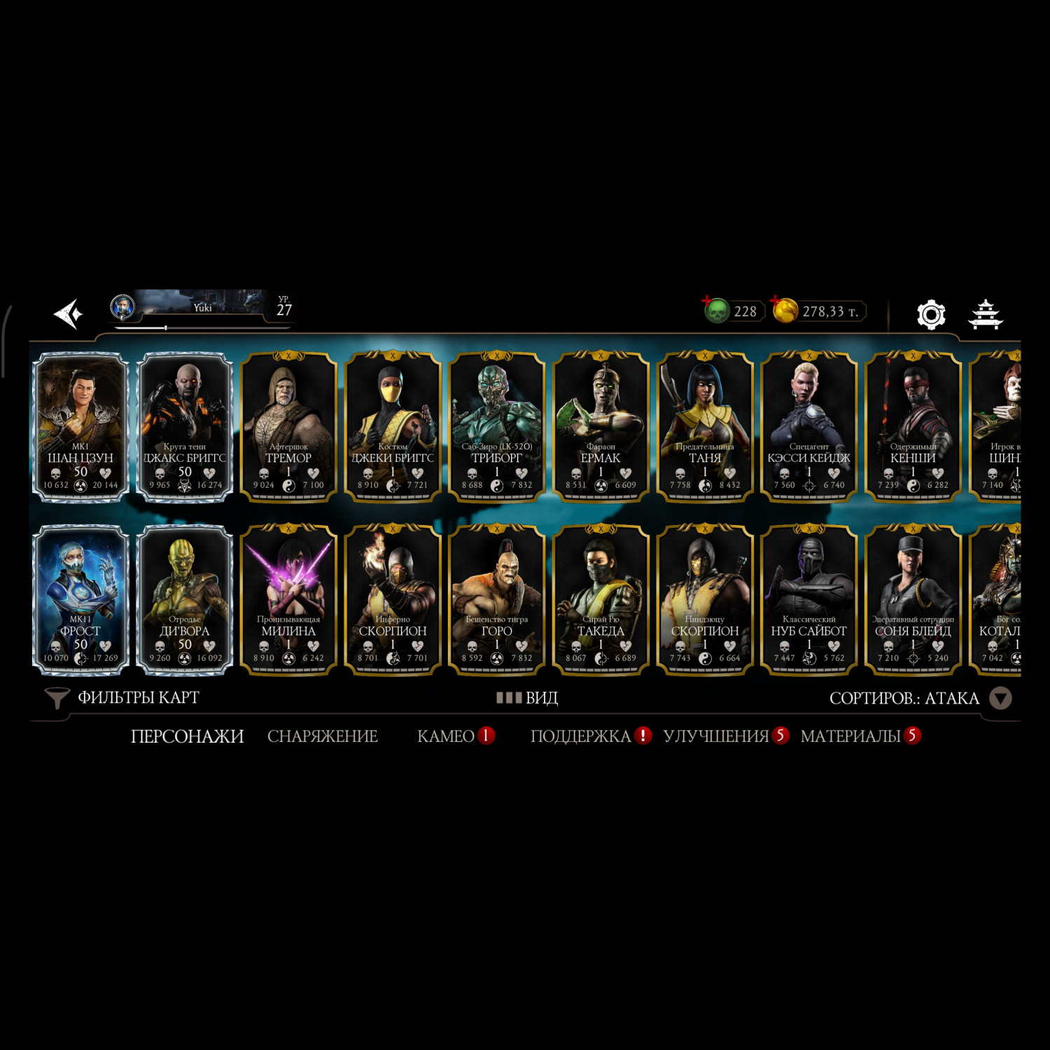 Аккаунт достаточно прокачен, 11 алмазных карт 10 слияния много редкого снаряжения прокаченого на X слияние много золотых карт 10 слияния, есть новые персонажи ФРОСТ мк11 Кенши мк1 Смоук мк1, 3 снярежения эденийской башни