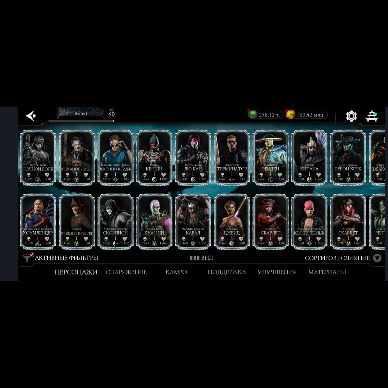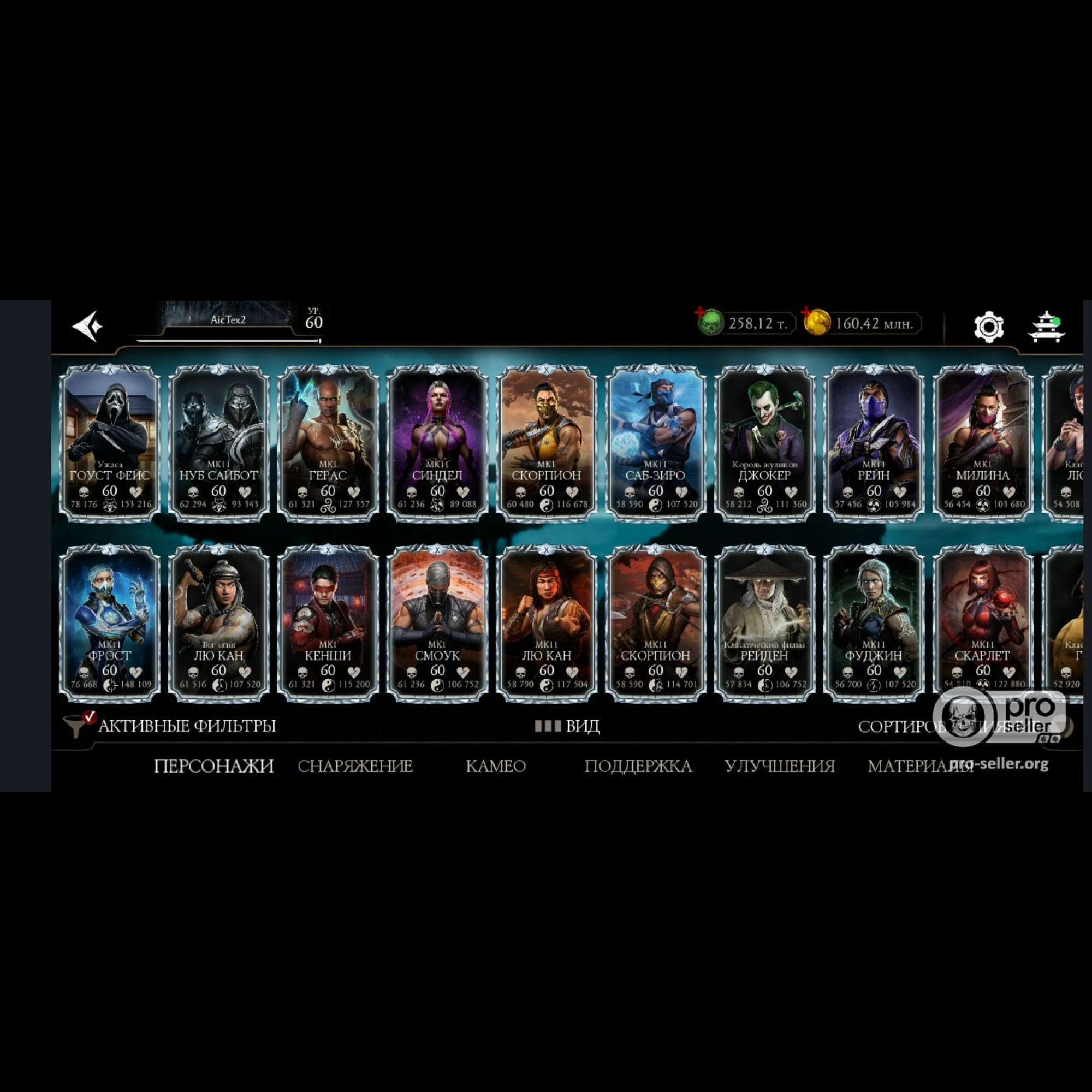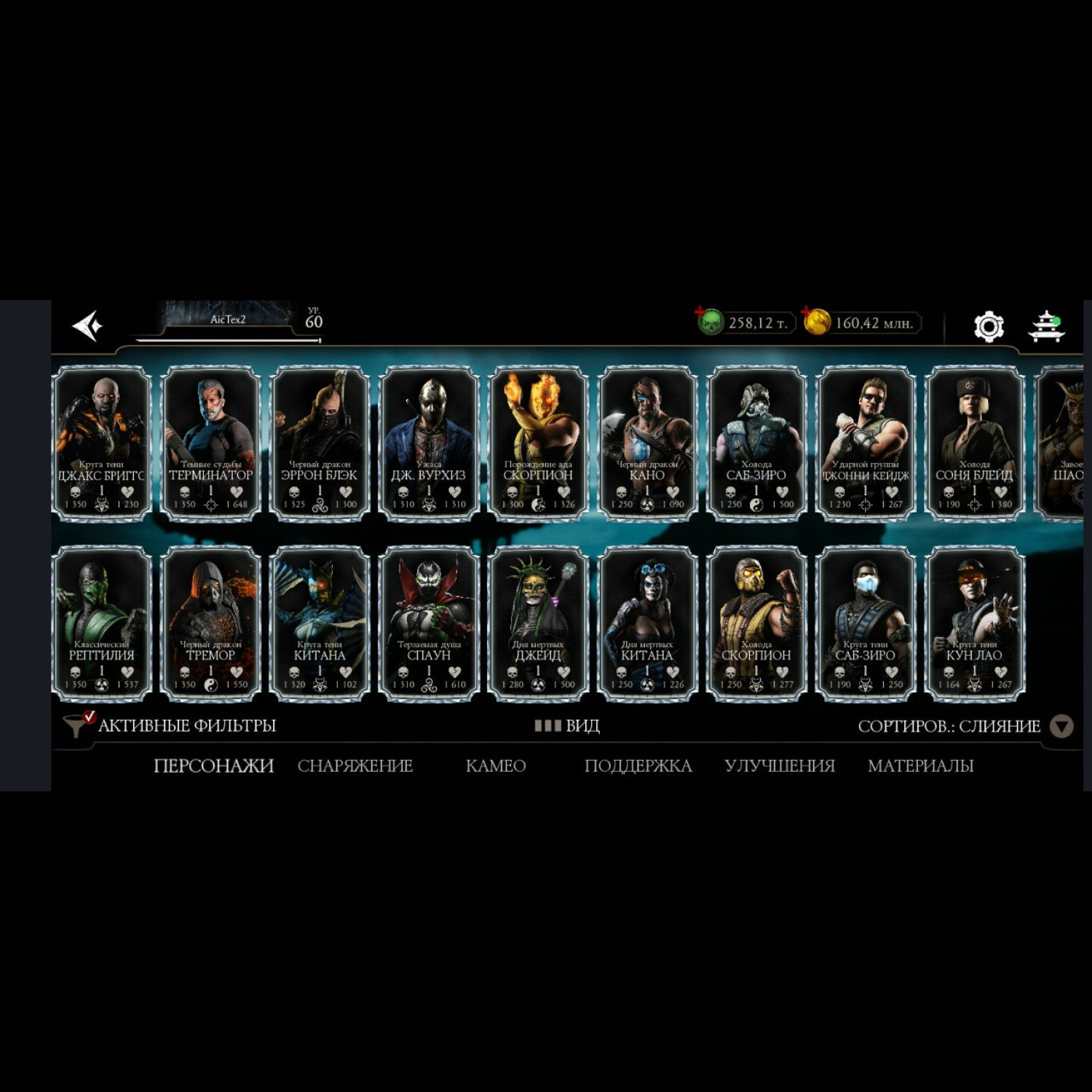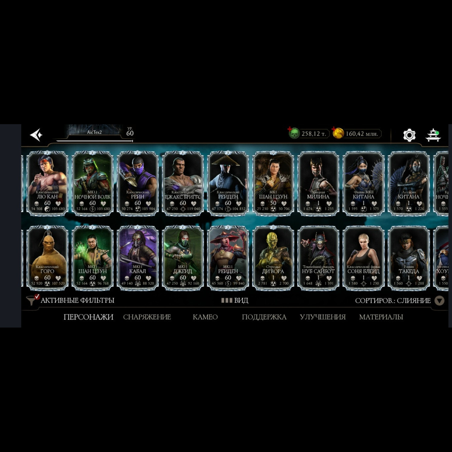 Есть все персонажи из игры. Не хватает всего 1 алмазного Шао Кана и 1 золотого Ночного волка. 28 алмазок Фул Х слияния ! Есть такие как: Гоуст Фейс, Фрост, Джокер, Милина МК1, Скорпион МК1, Нуб Сайбот, Герас МК1 и многие сильные другие, и они все Х слияния. Все золотые которые есть, все они Фул Х слияния. Так же тут есть очень много Камео бойцов) + Есть вся редкая именная снаряга + большинство снаряги из Крипты и башен (70%) много комплектов бруталити и фрэндшипов. + 258 тысяч душ + карты повышения уровня + 34 660 кристаллов дракона для дальнейшей спокойной игры без проблем))