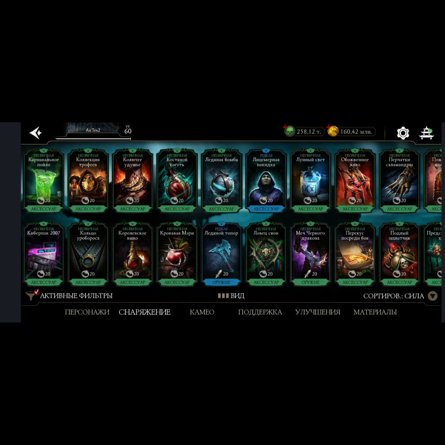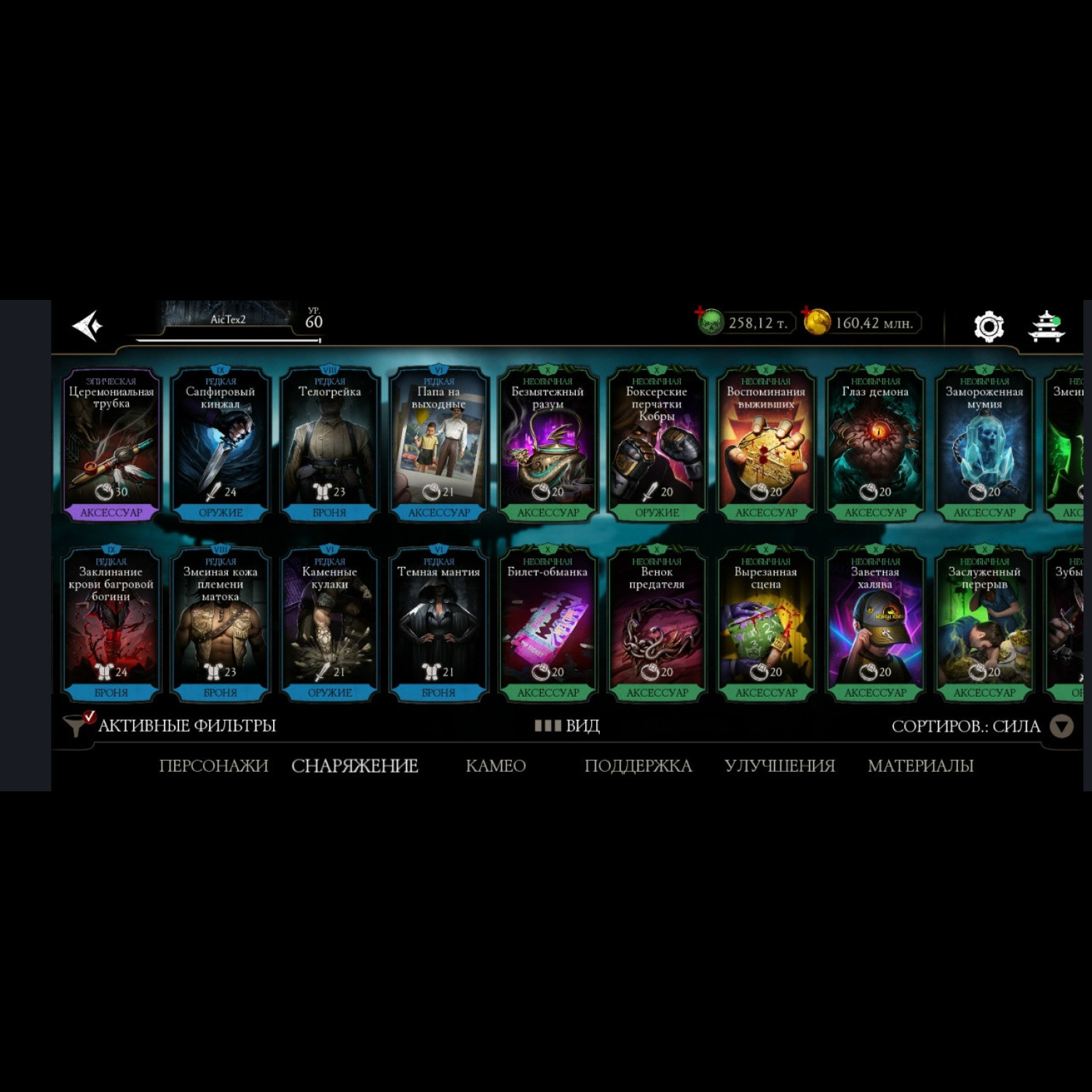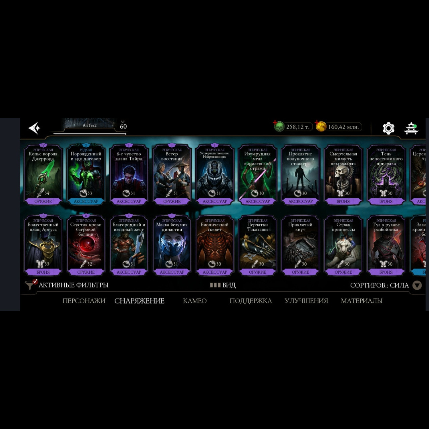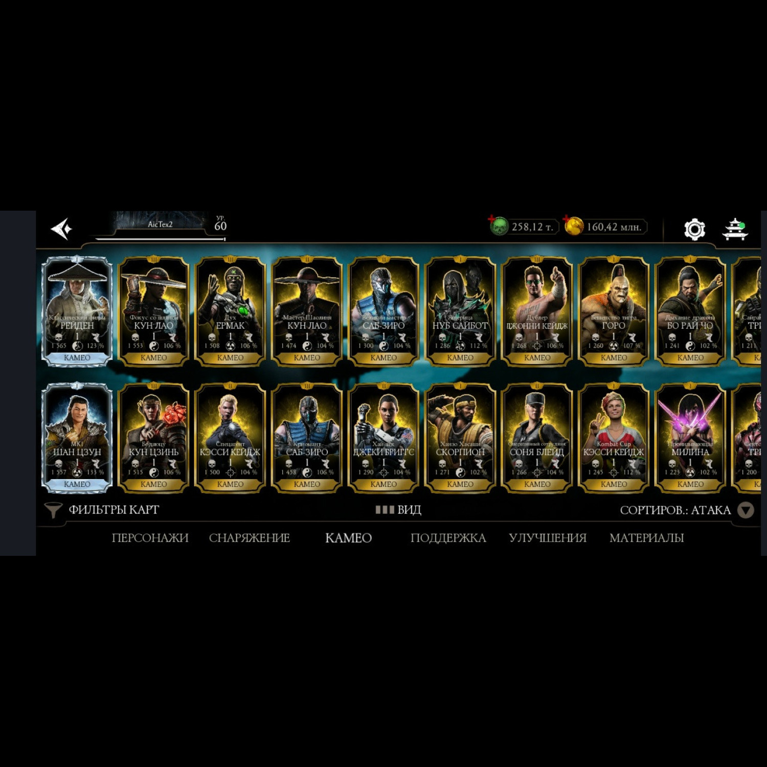 Есть все персонажи из игры. Не хватает всего 1 алмазного Шао Кана и 1 золотого Ночного волка. 28 алмазок Фул Х слияния ! Есть такие как: Гоуст Фейс, Фрост, Джокер, Милина МК1, Скорпион МК1, Нуб Сайбот, Герас МК1 и многие сильные другие, и они все Х слияния. Все золотые которые есть, все они Фул Х слияния. Так же тут есть очень много Камео бойцов) + Есть вся редкая именная снаряга + большинство снаряги из Крипты и башен (70%) много комплектов бруталити и фрэндшипов. + 258 тысяч душ + карты повышения уровня + 34 660 кристаллов дракона для дальнейшей спокойной игры без проблем))