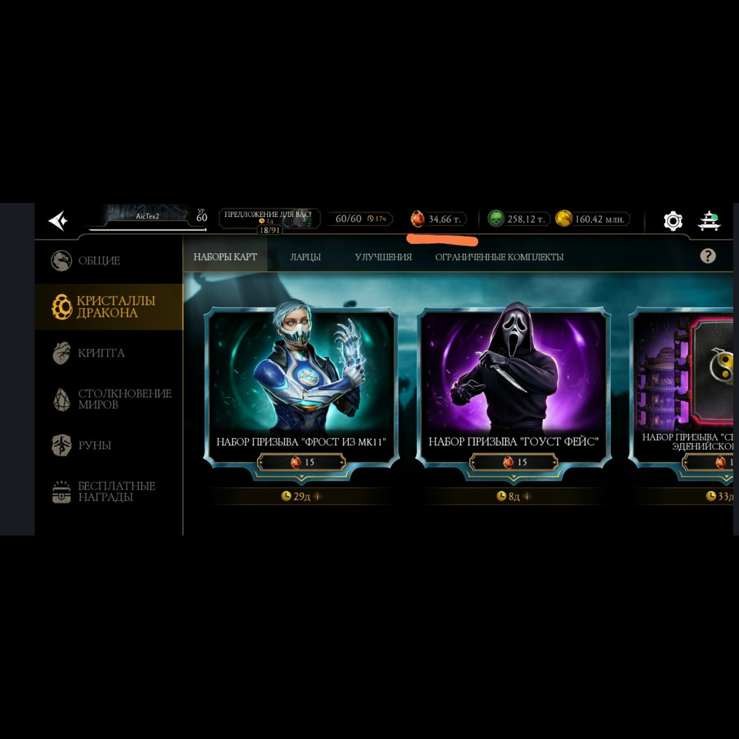 На аккаунте имеются 34 660 кристаллов дракона!