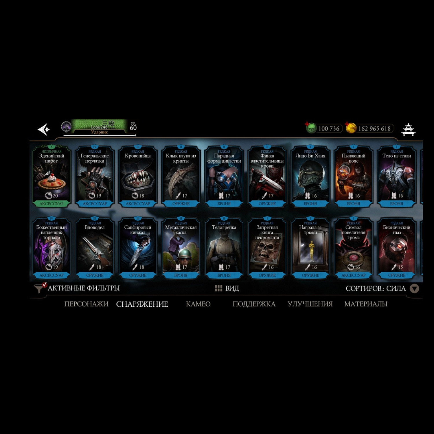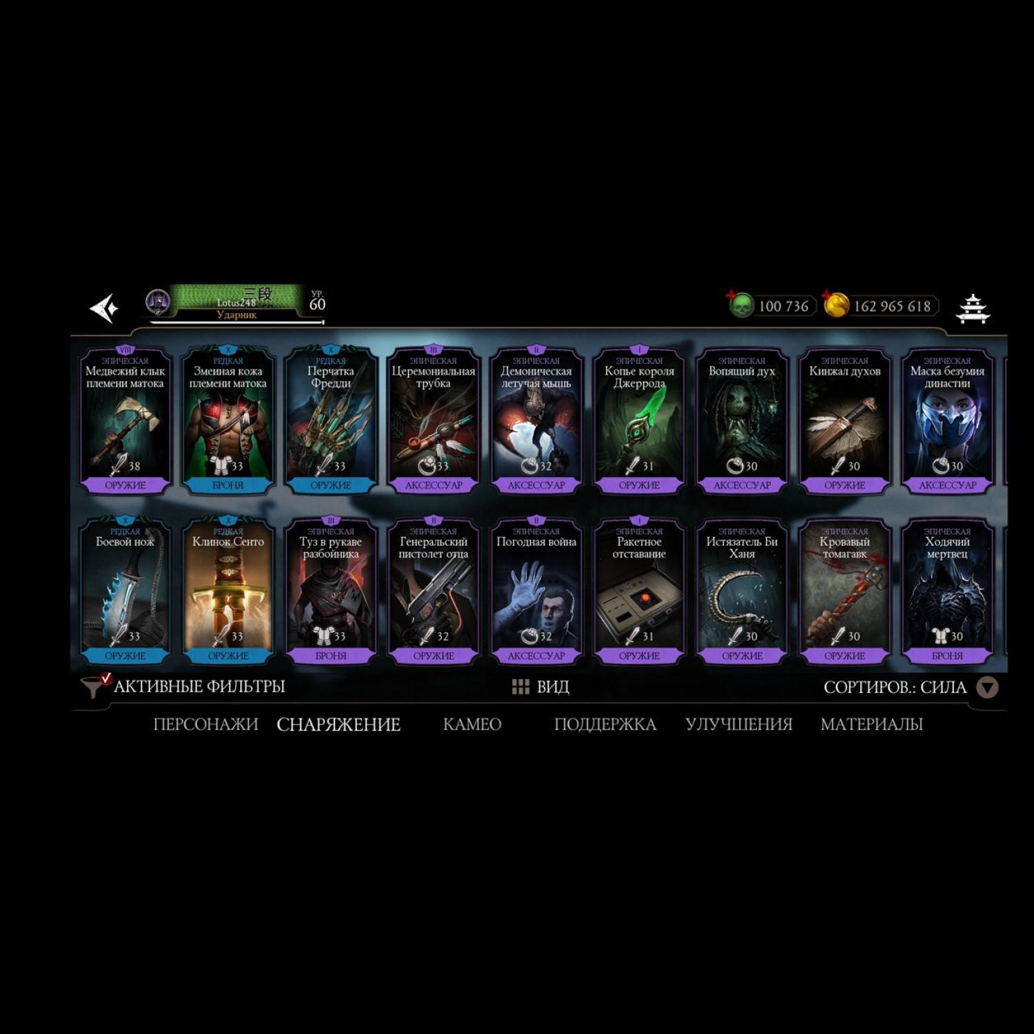 Есть почти все золотые из игры, 84 из 86 карт, из них 70 золотых карт Х слияния. Есть вся редкая именная снаряга + снаряга из башен а так же 722 карт уровней и 100 к душ.