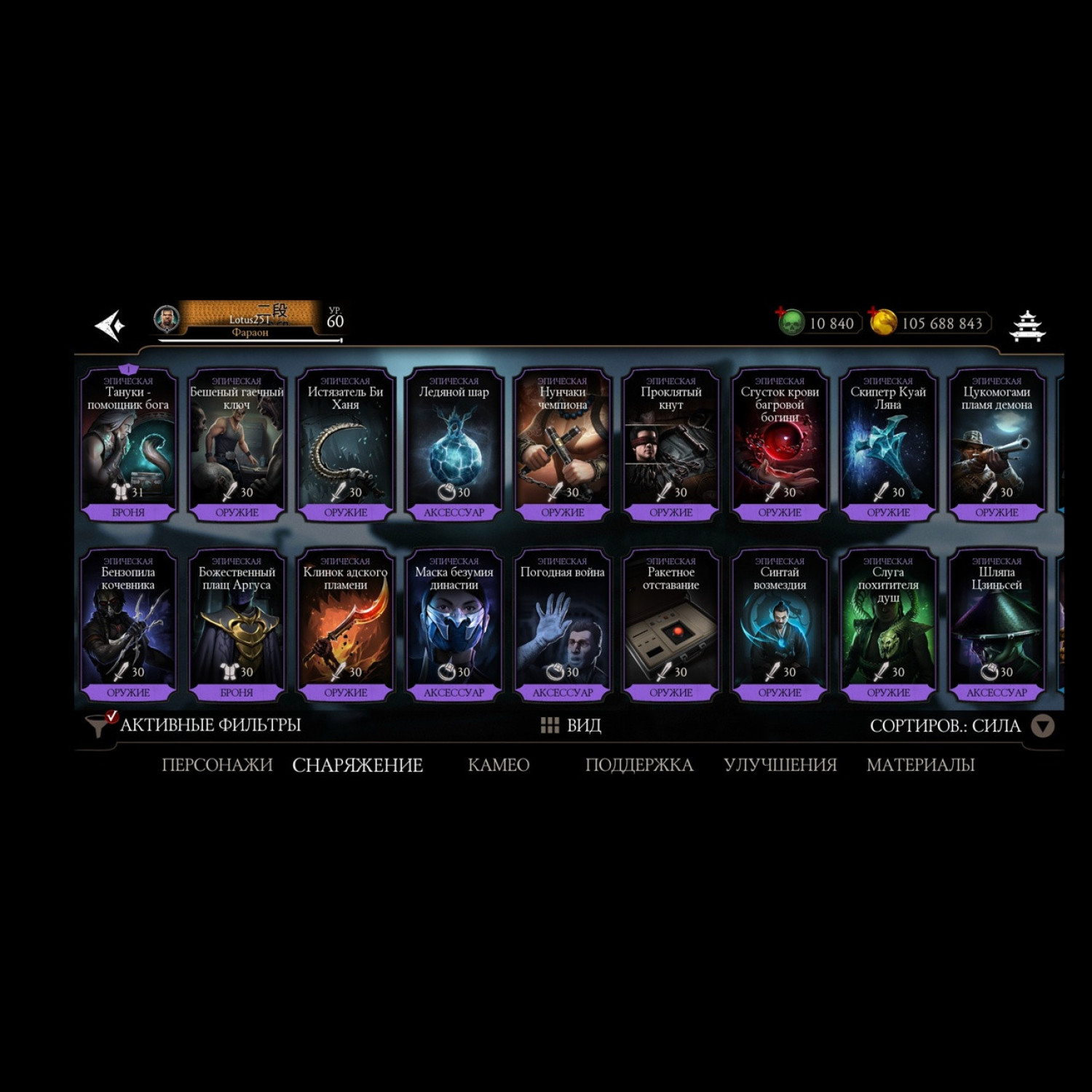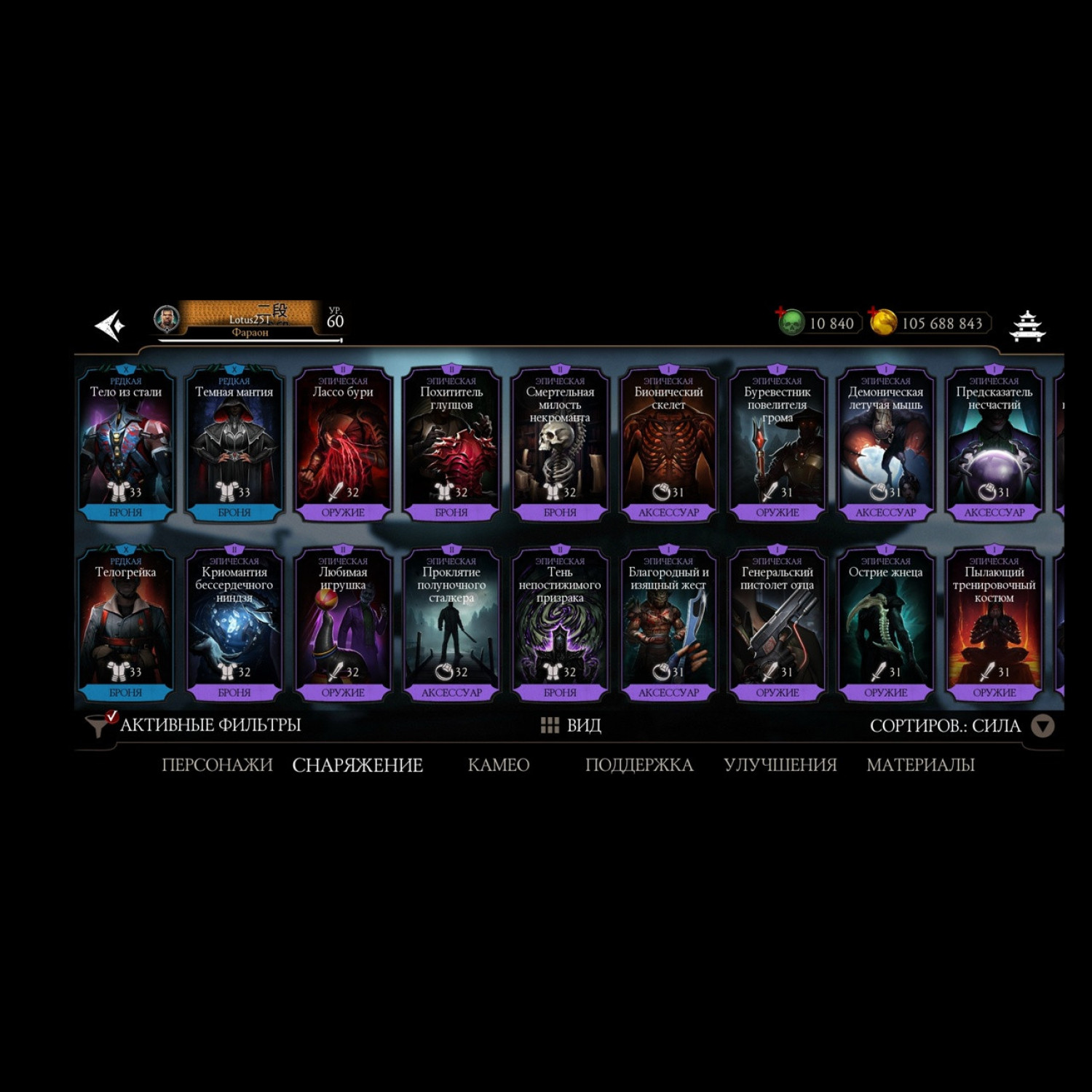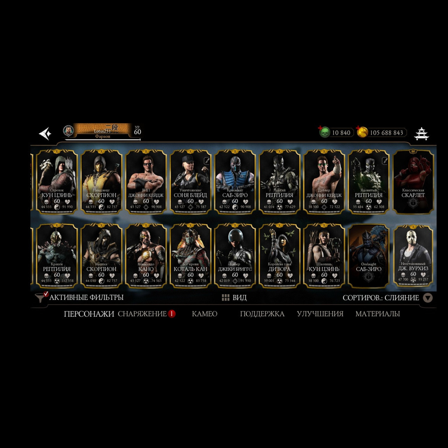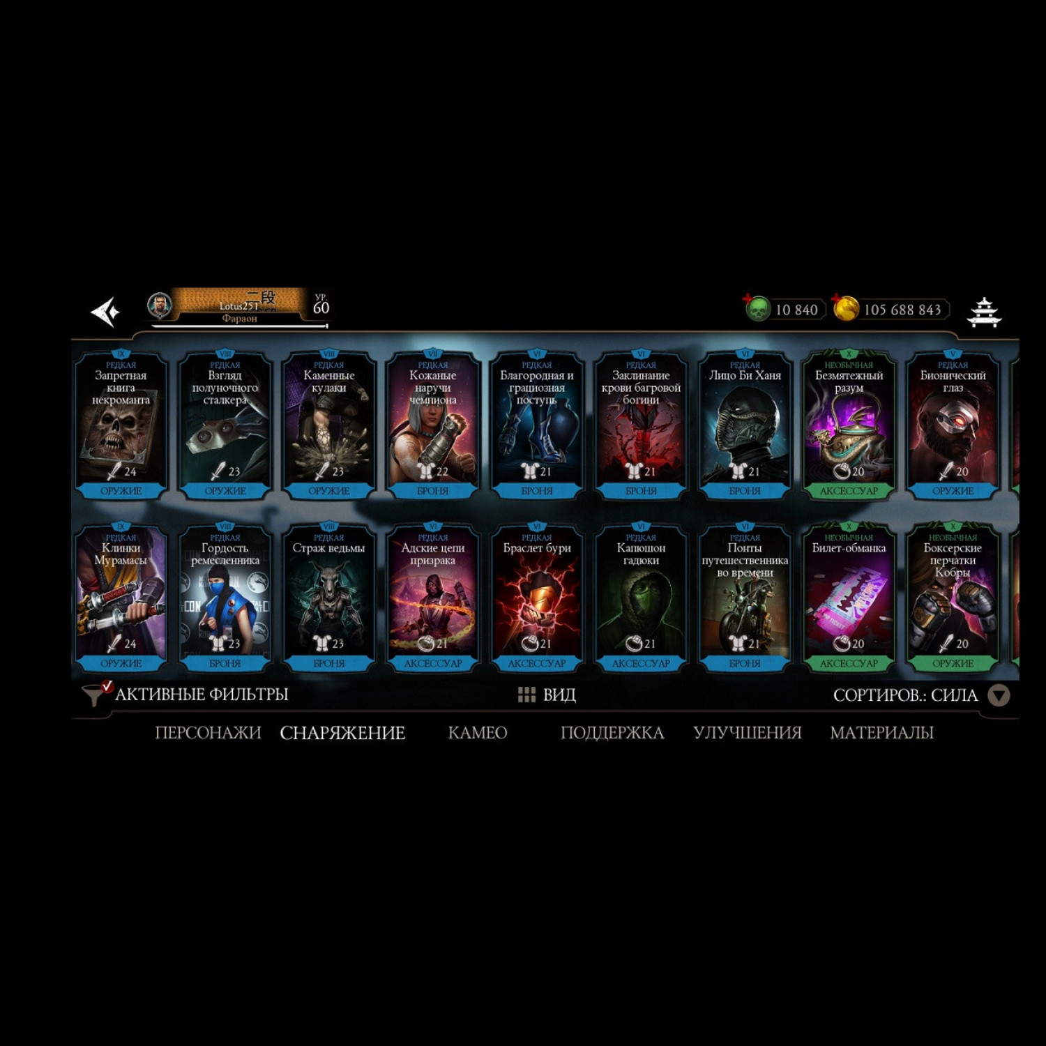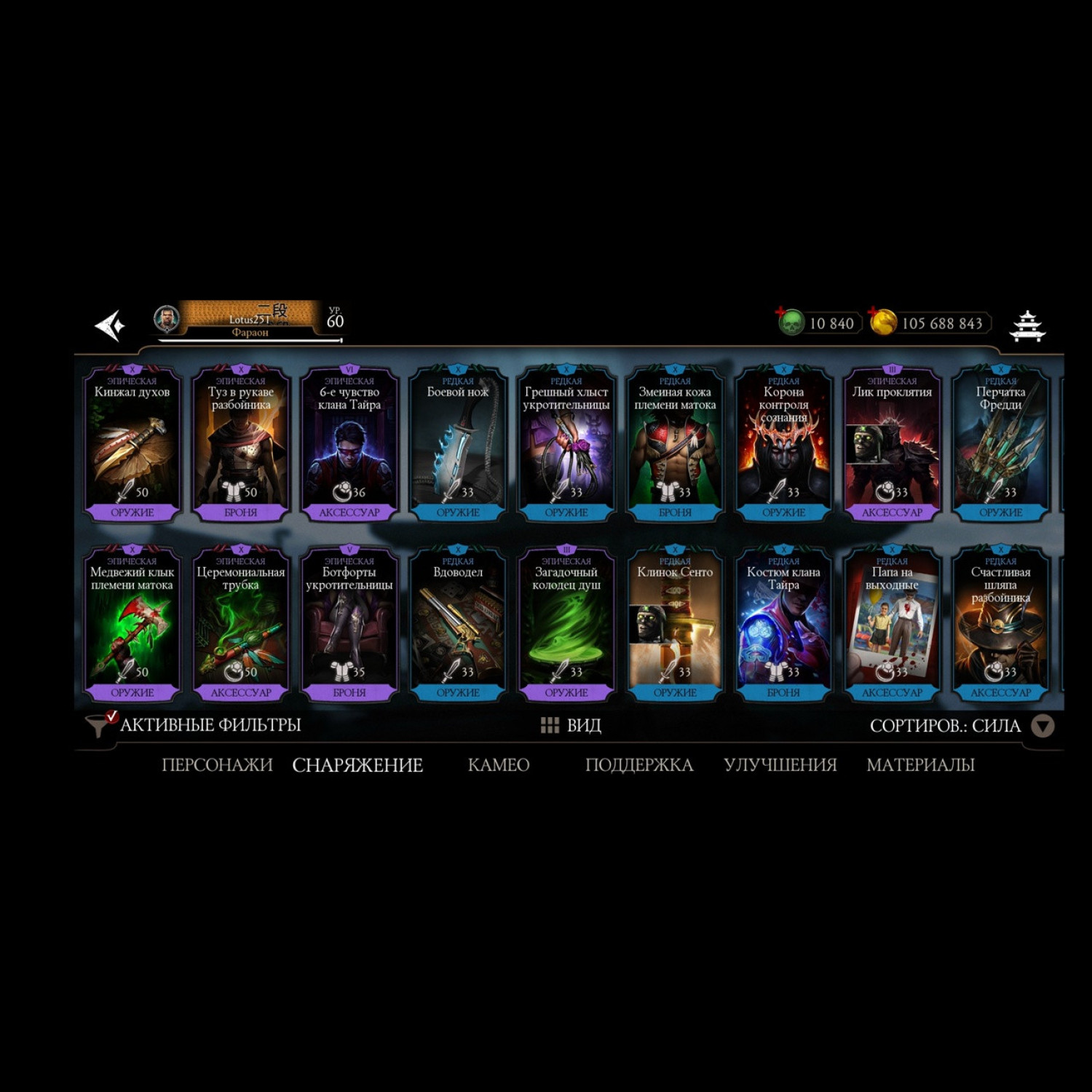 Есть почти все золотые из игры, не хватает всего 2 карты, из золотых все кто есть - все они Х слияния. Есть вся редкая именная снаряга и снаряга из башен, процентов 85-90 имеется, есть много бруталок и фрэндшипов, а так же 10 к душ для дальнейшей активной игры)