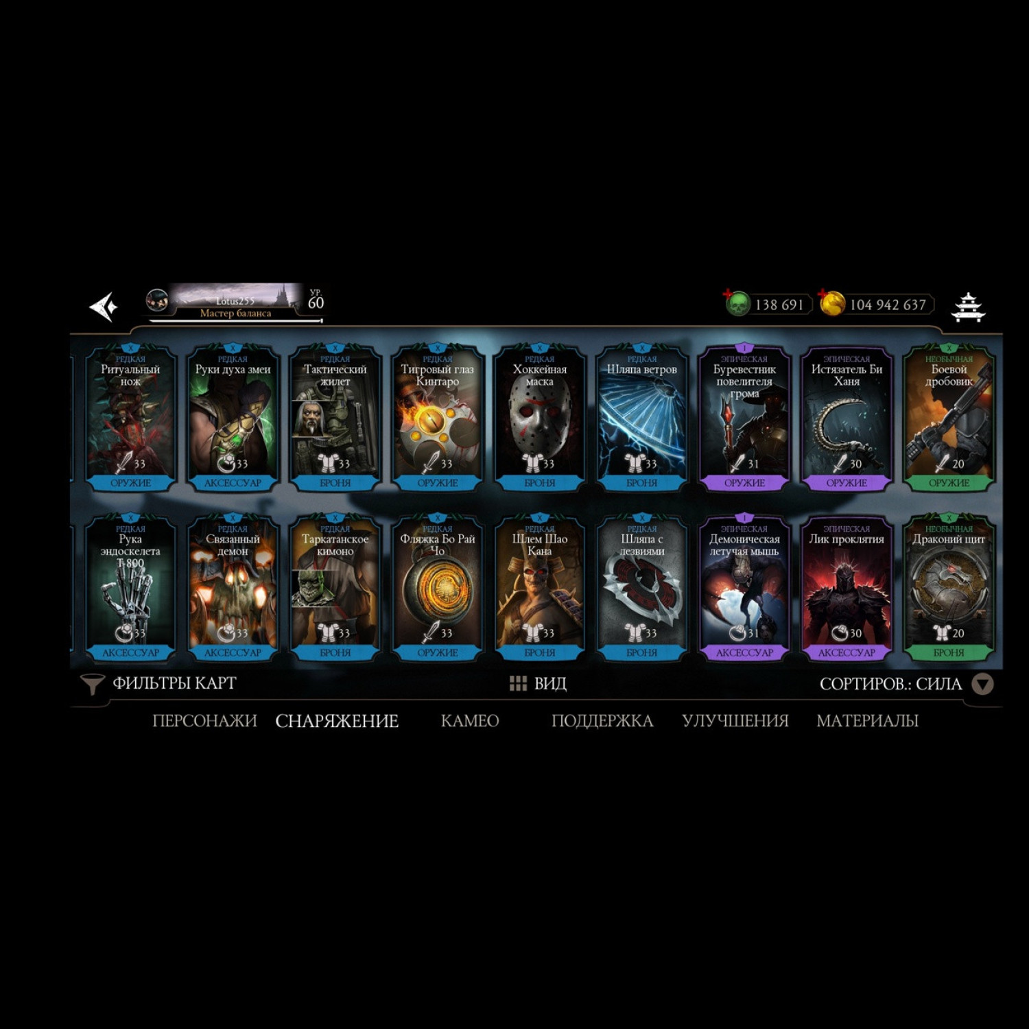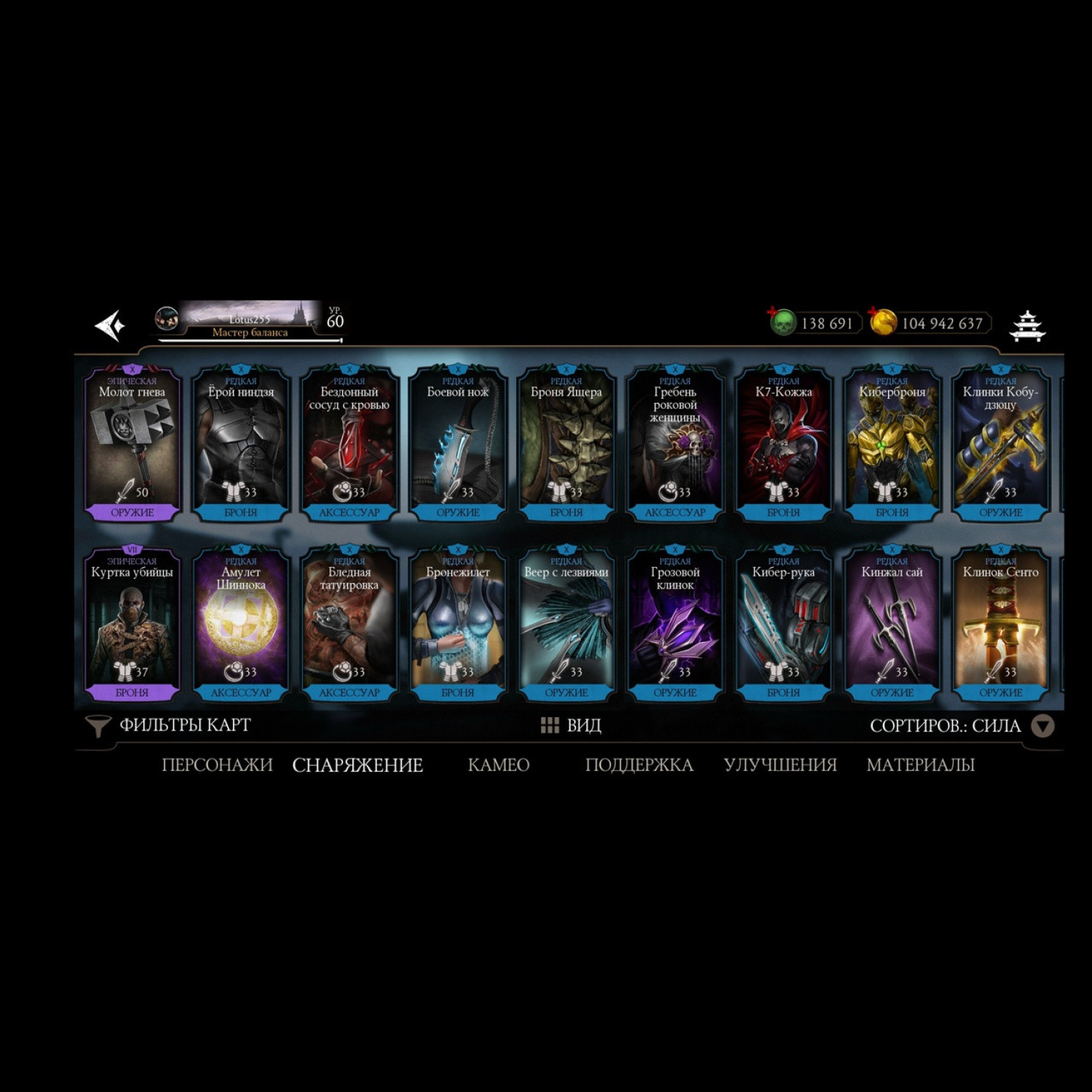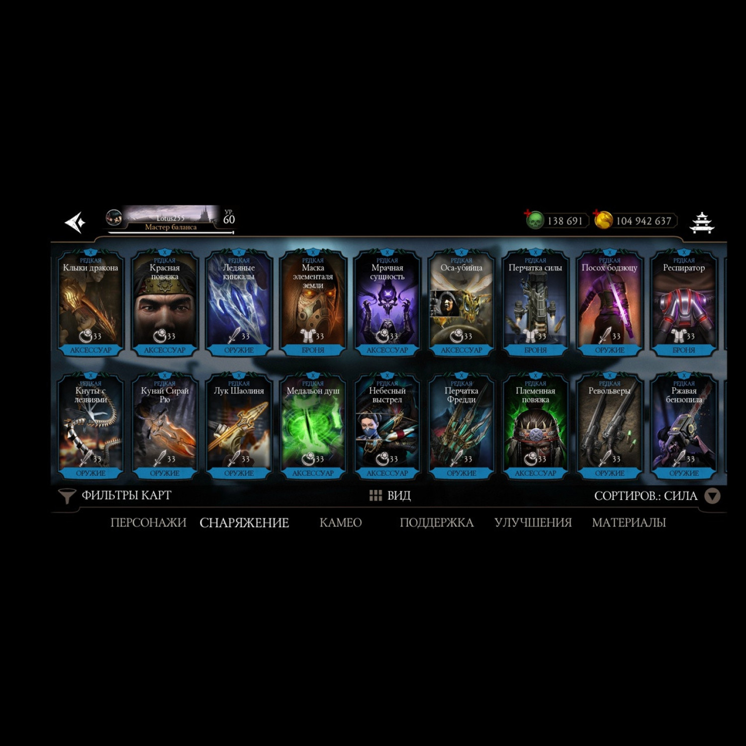 Есть абсолютно все золотые из игры, из золотых большинство карт Х слияния. Есть вся редкая именная снаряга и немного снаряги из башен а так же 138 к душ.
