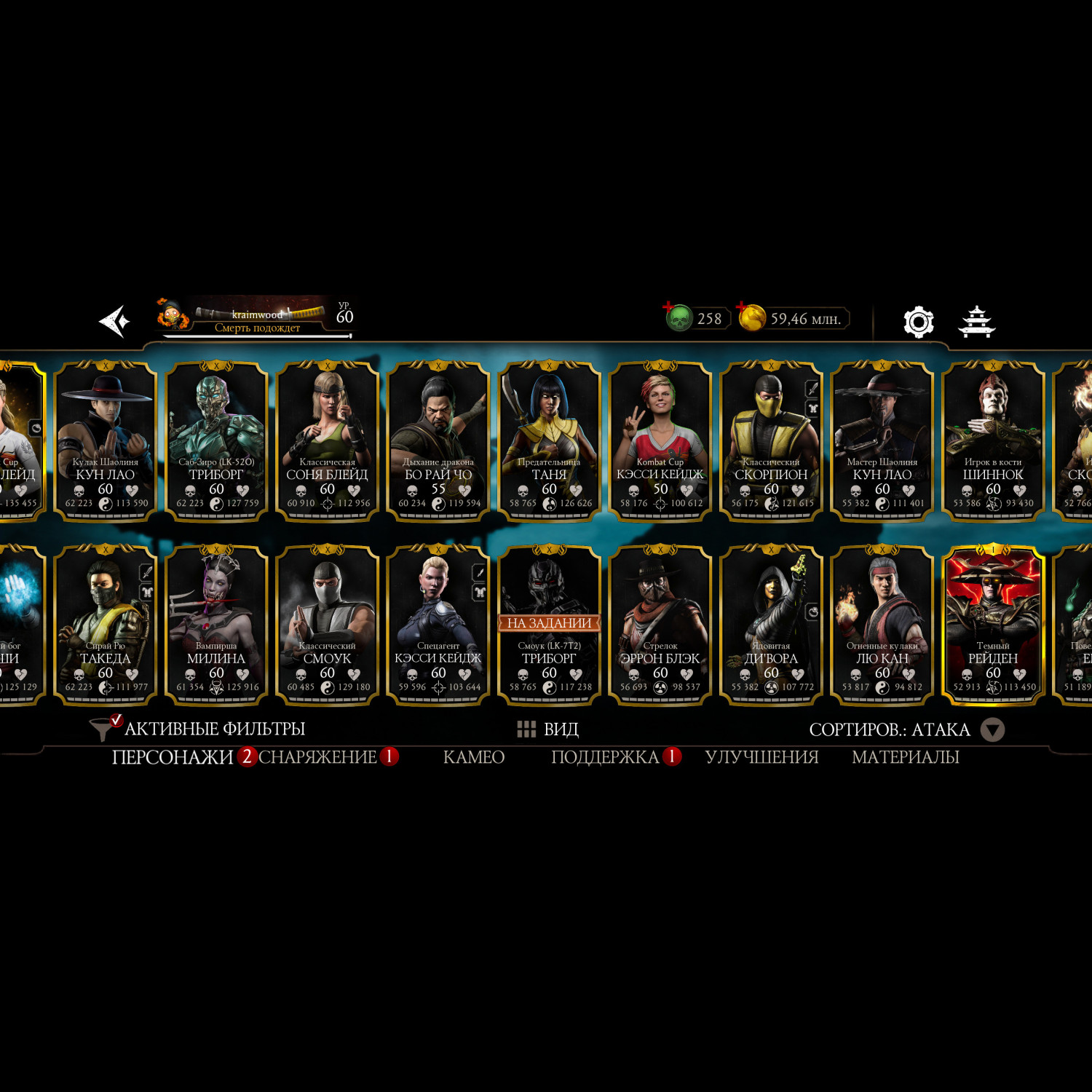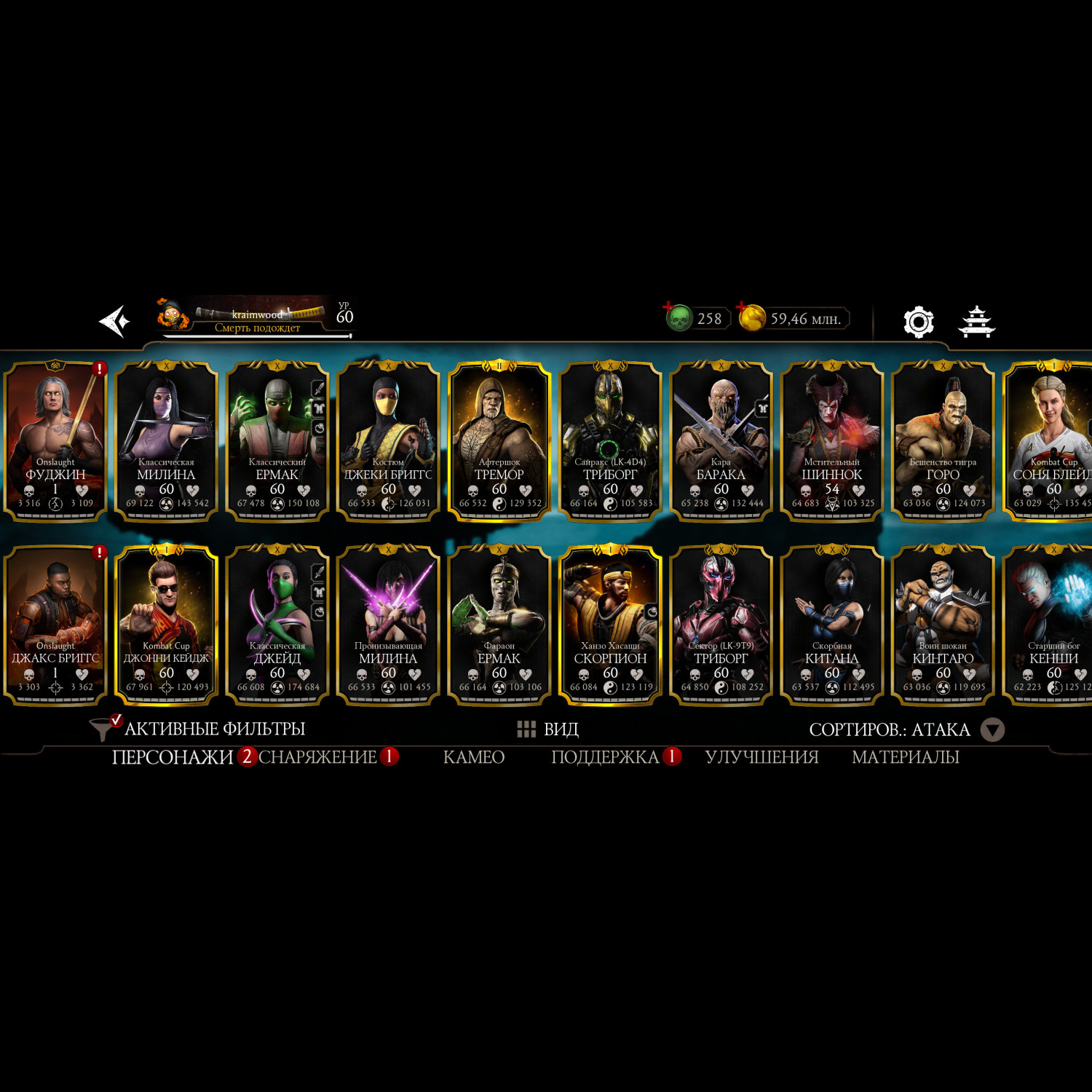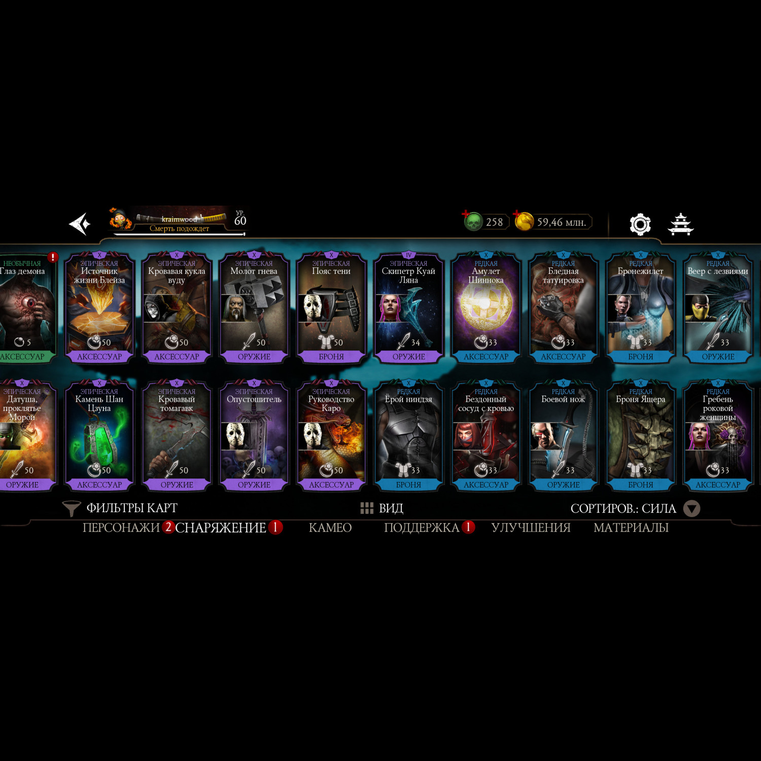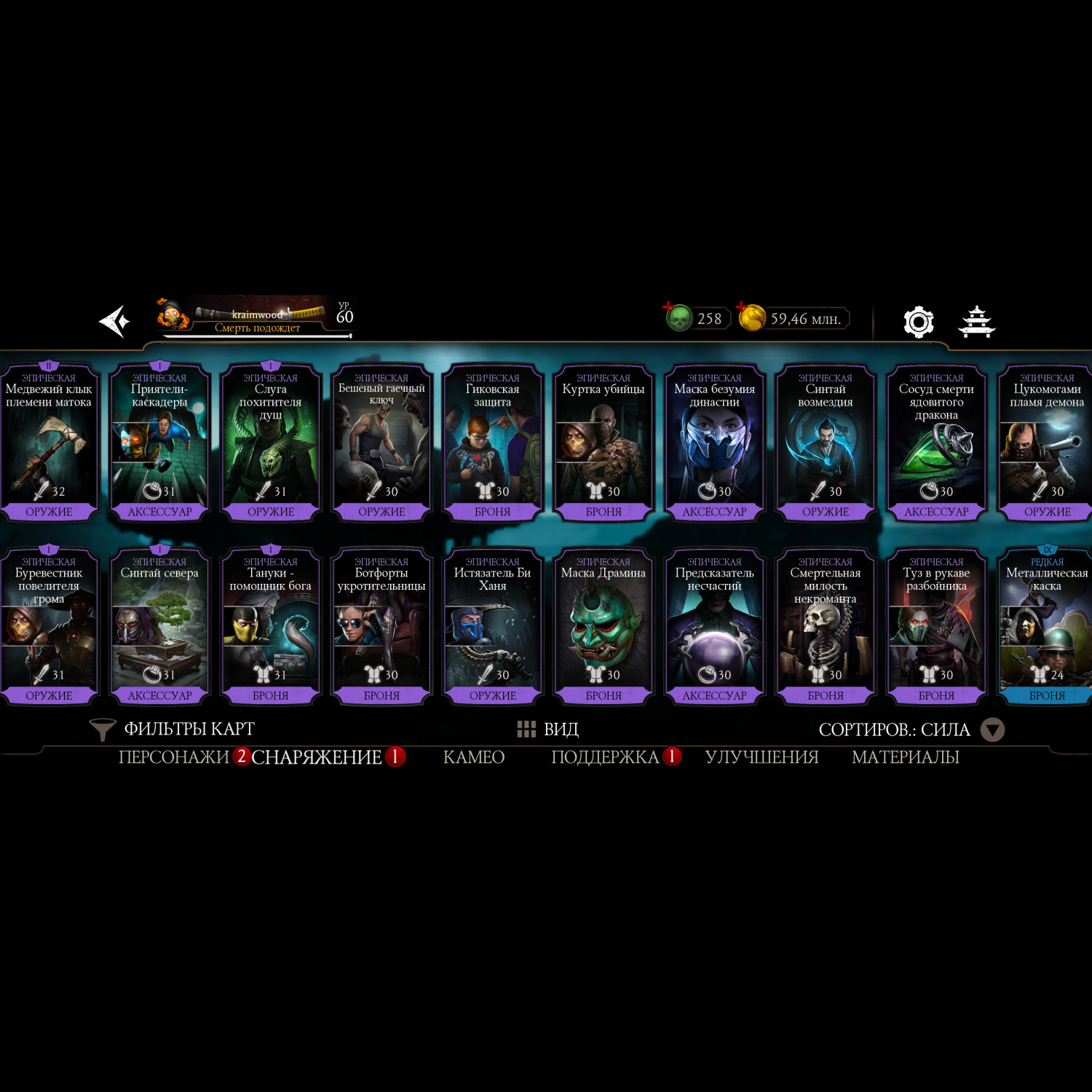 Почти полная коллекция алмазных карт, за неимением недавно вышедших бойцов. Имеется снаряжение с башен. На этом акаунте вполне комфортно будет играть, есть куда стремится.